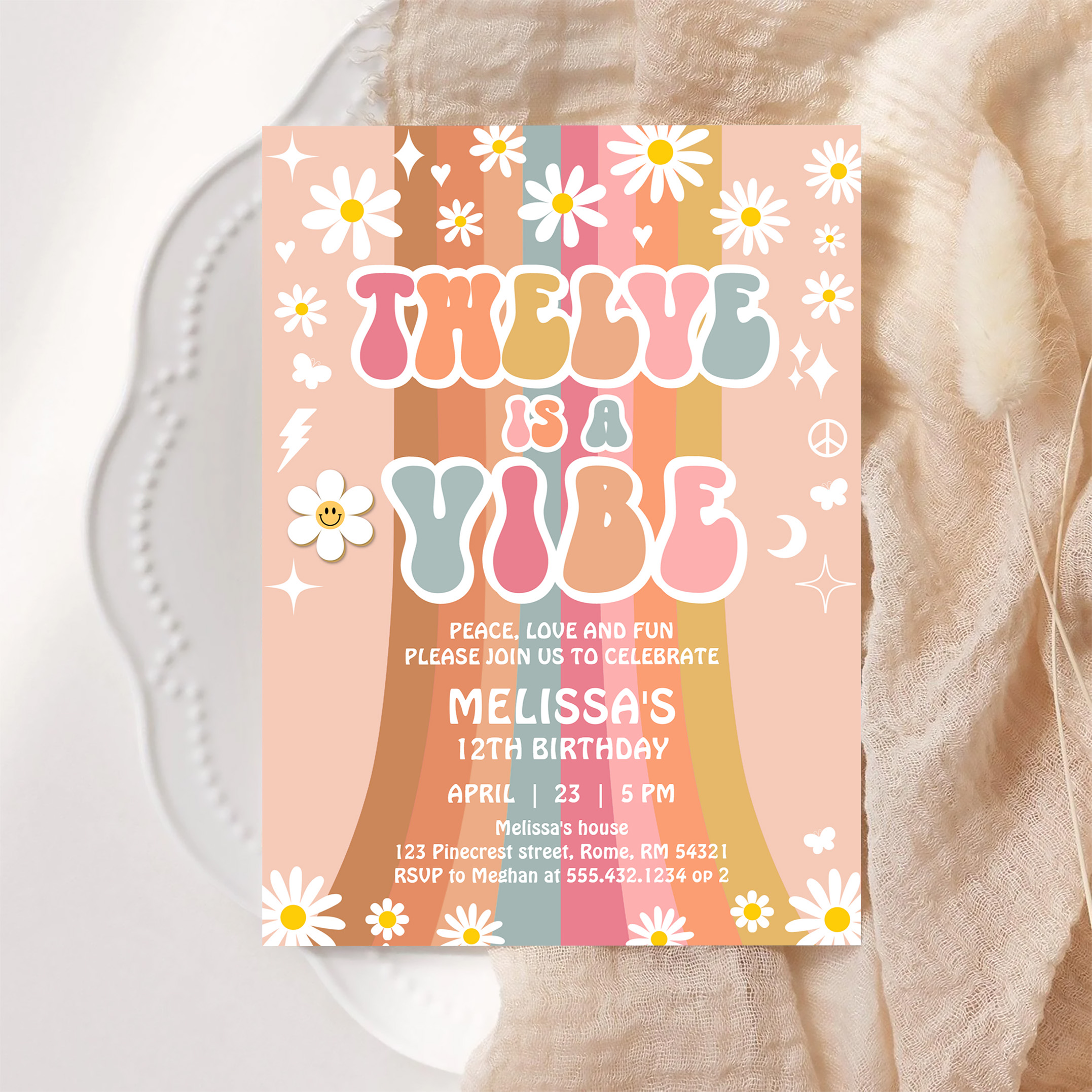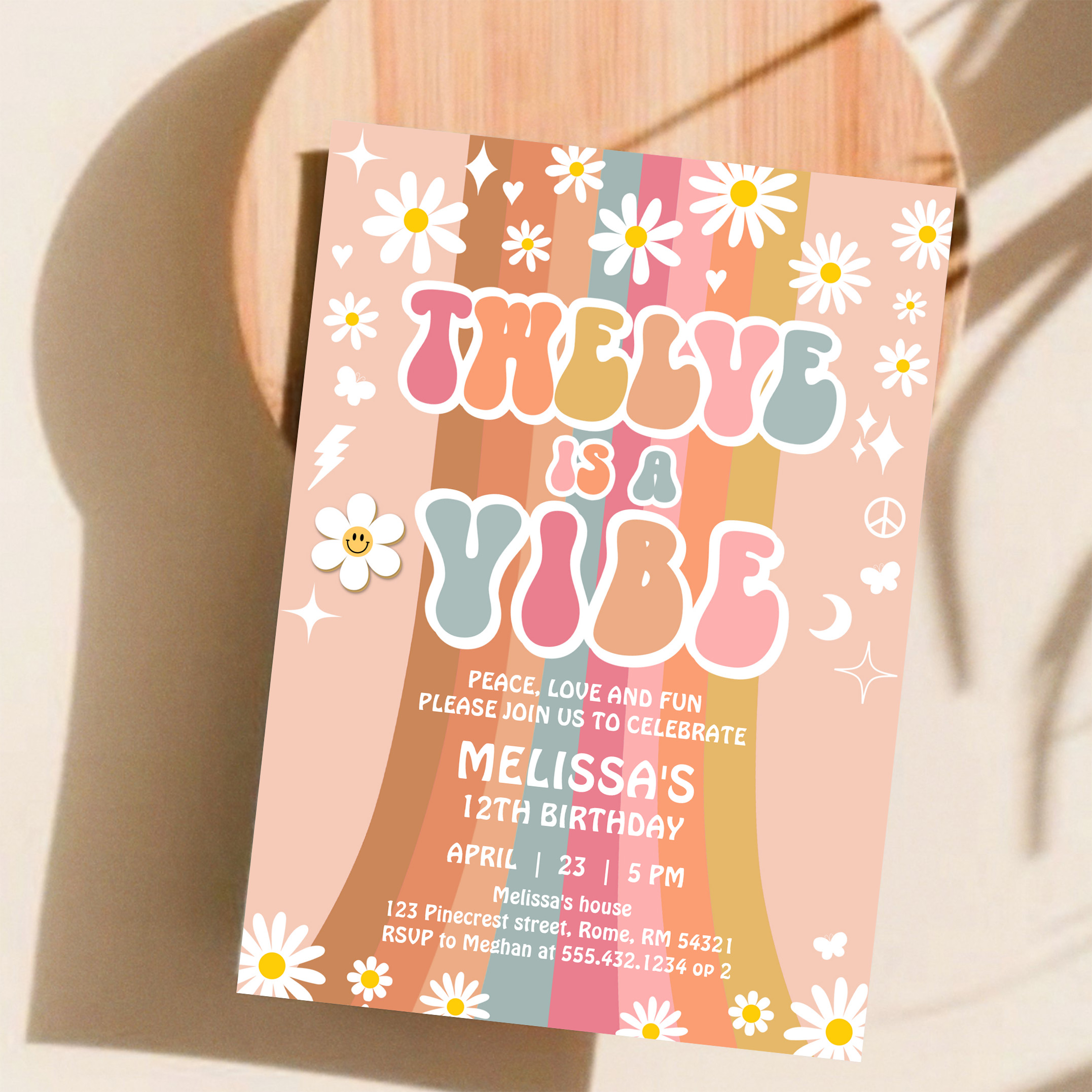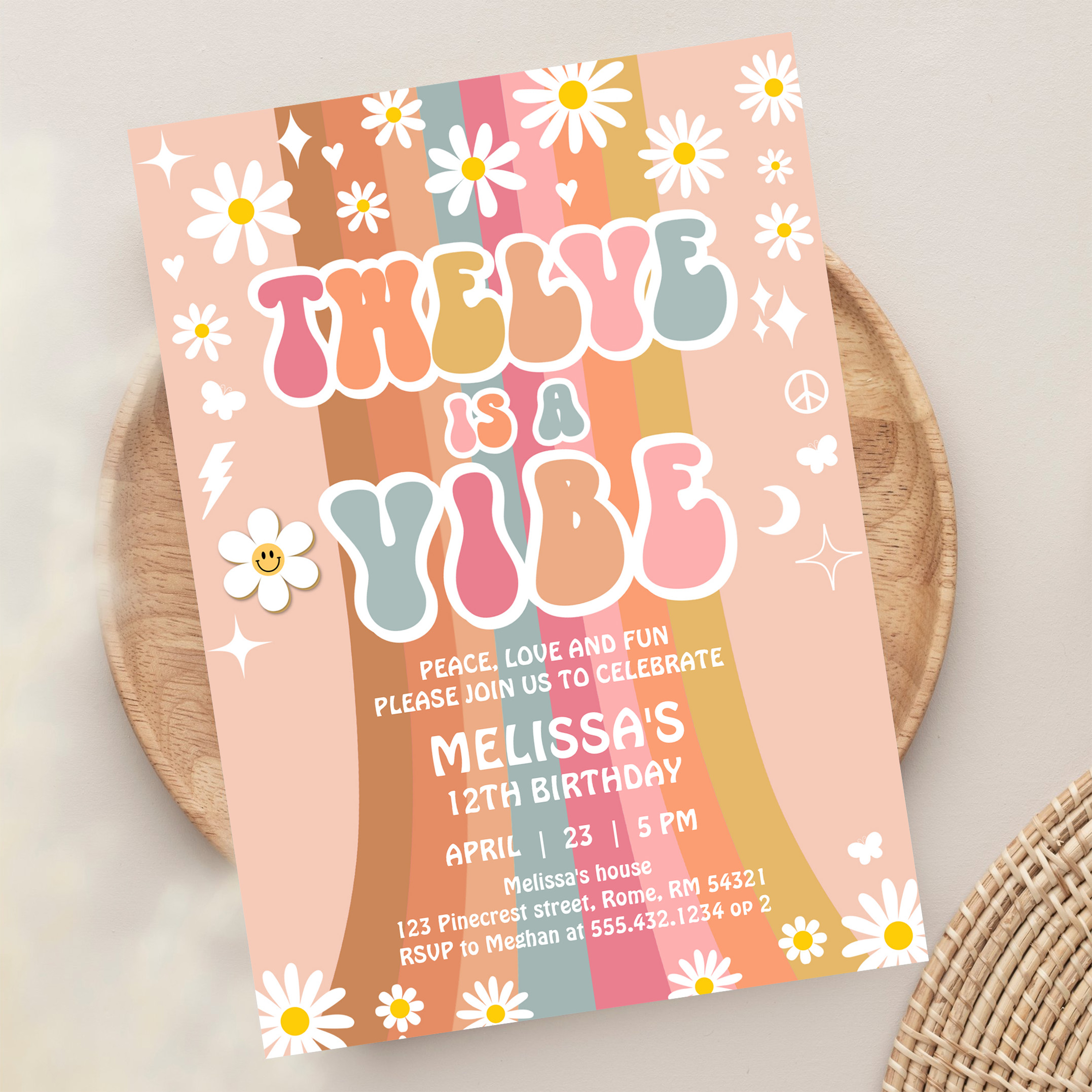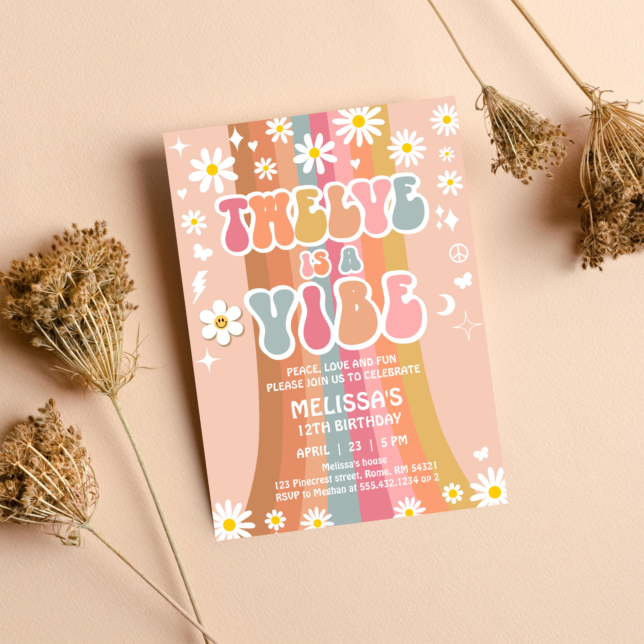 Twelve Is A Vibe Rainbow Groovy 12th Birthday Invitation