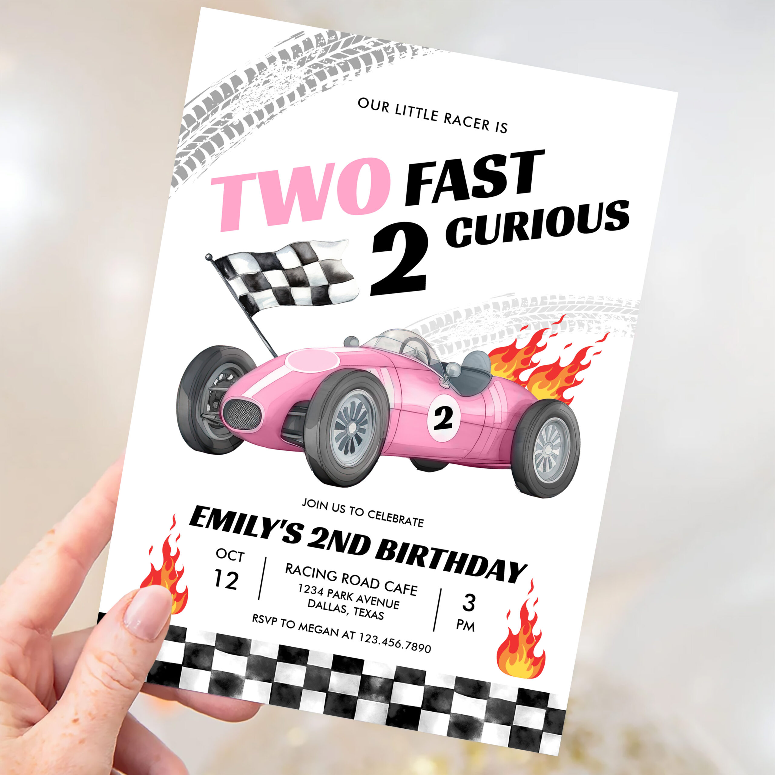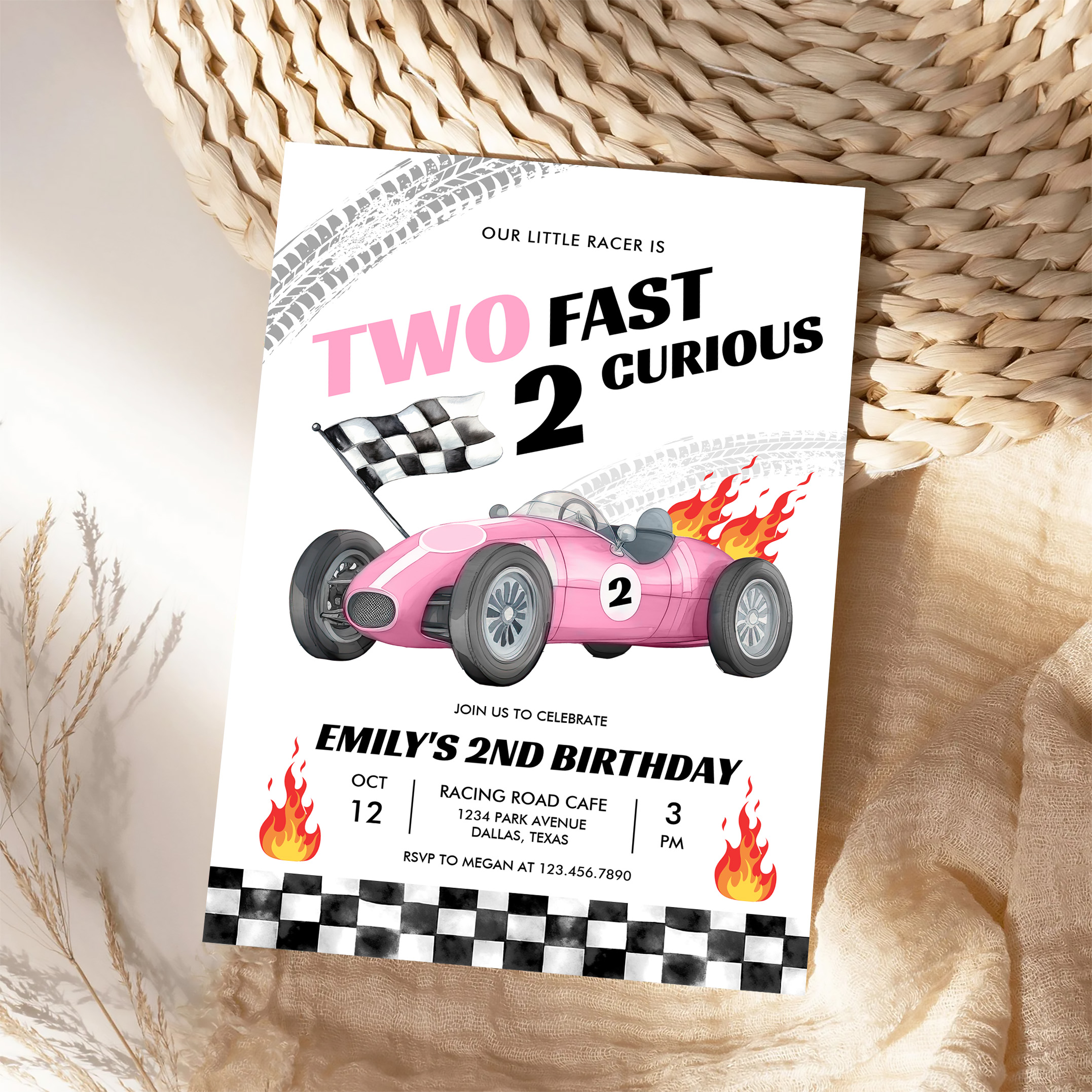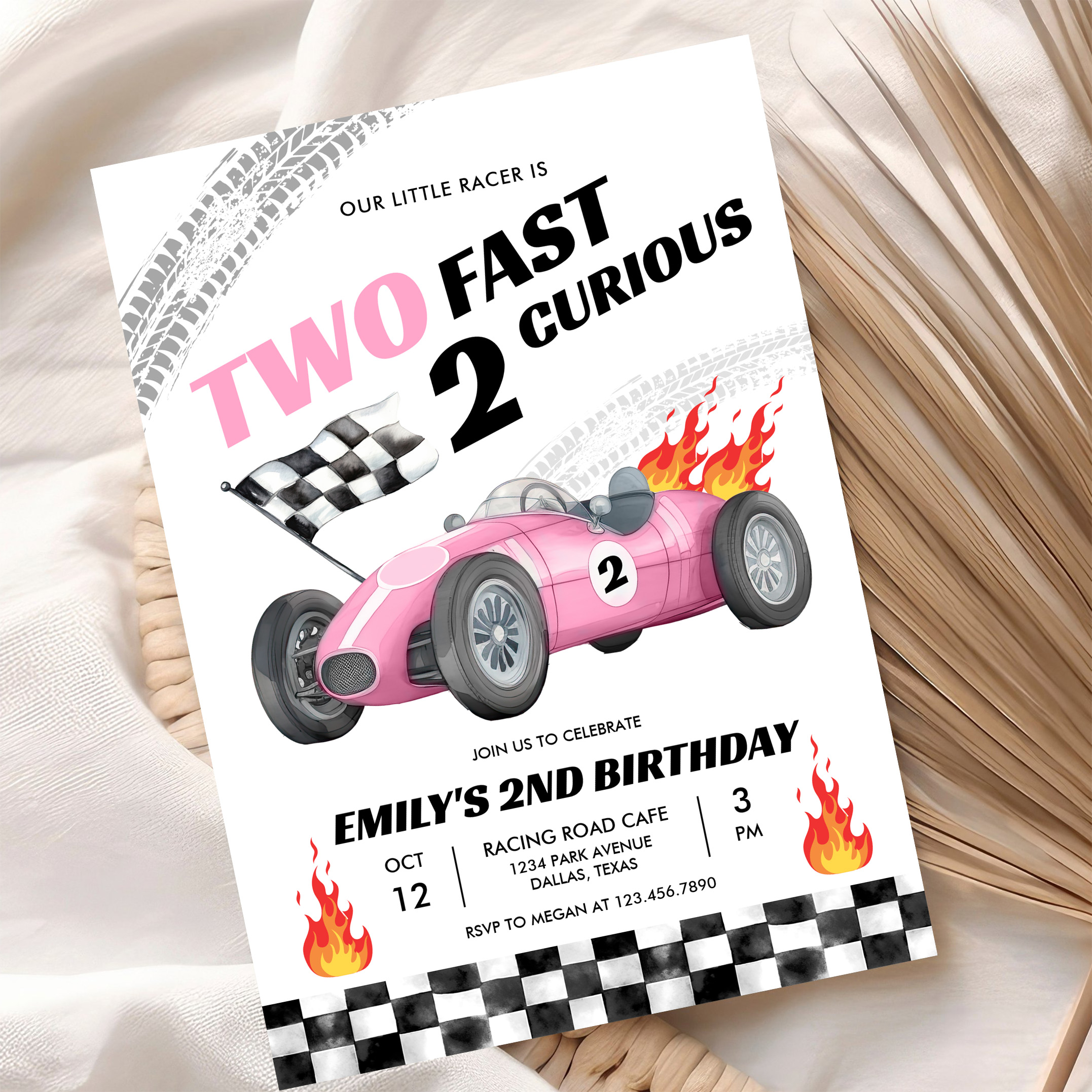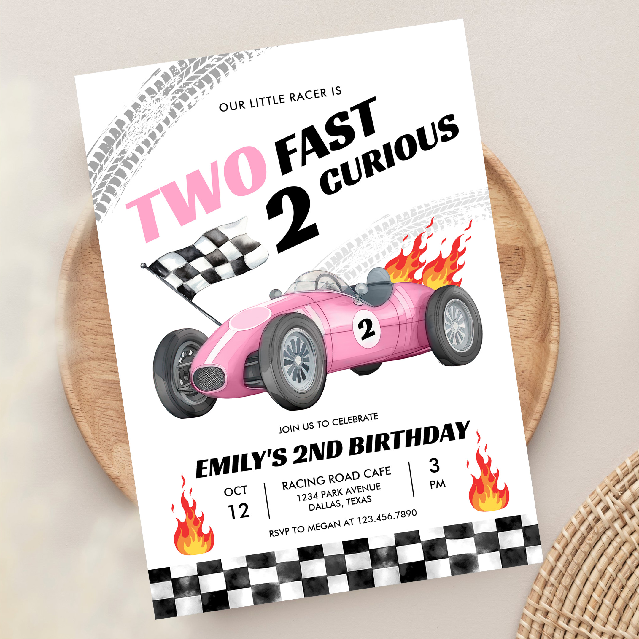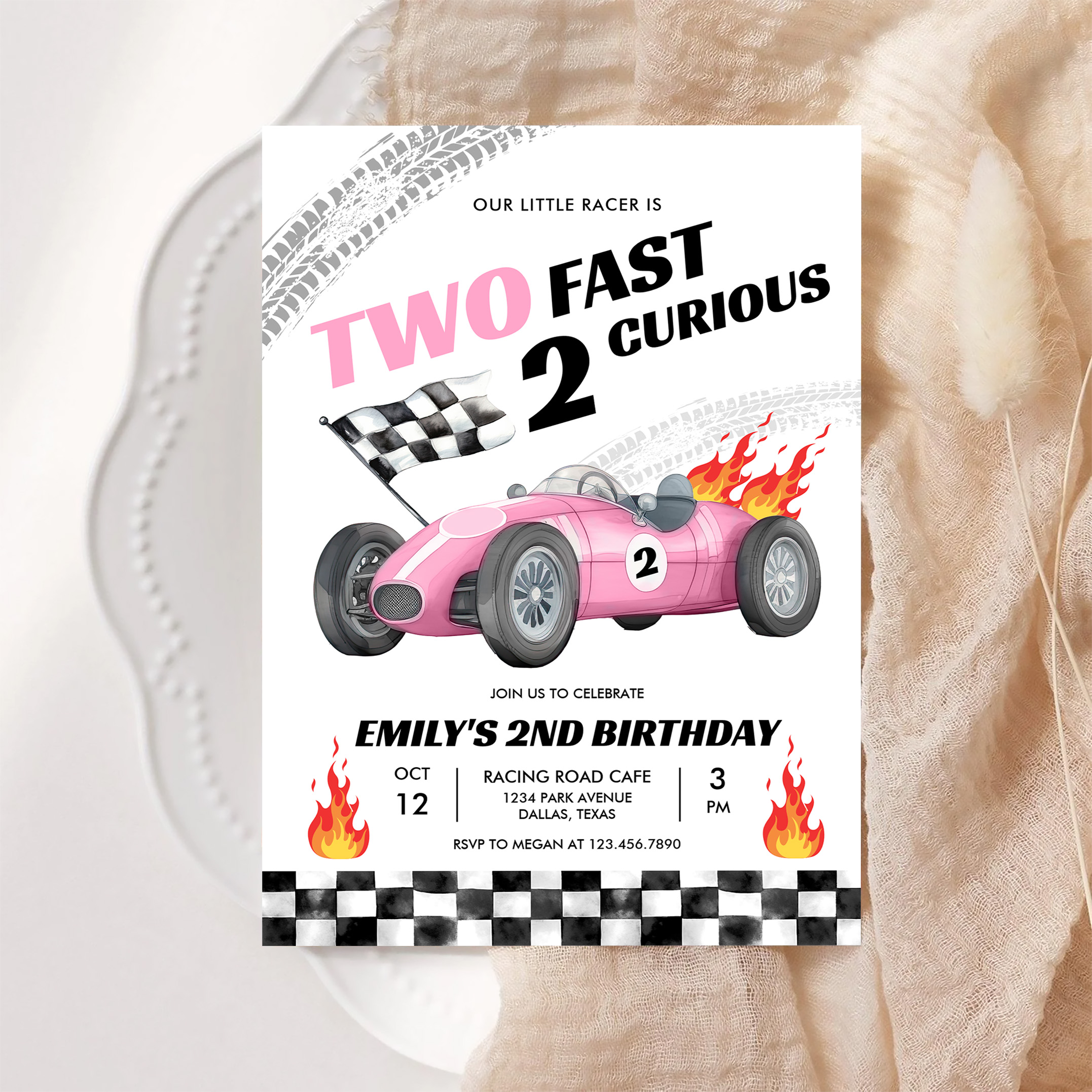 Two Fast Race Pink Car 2nd Girl Birthday Invitation