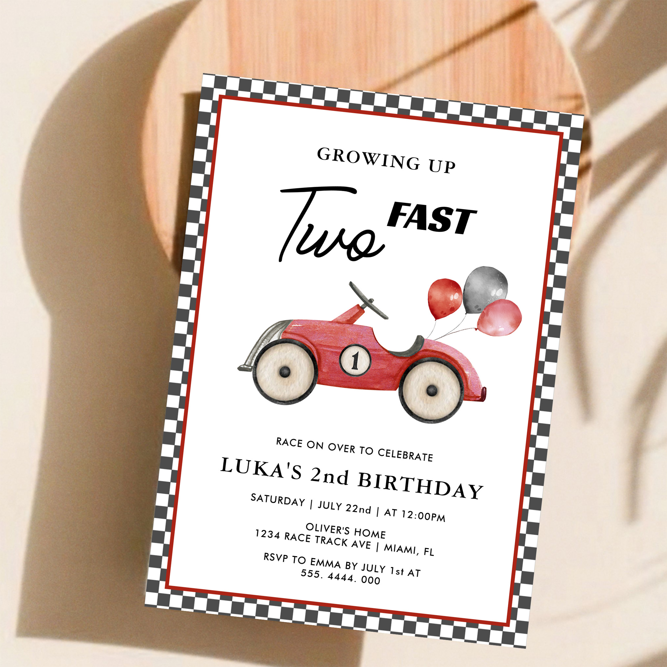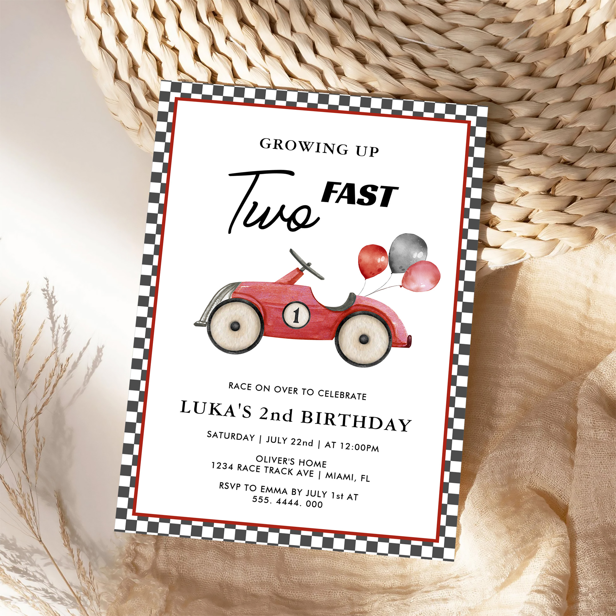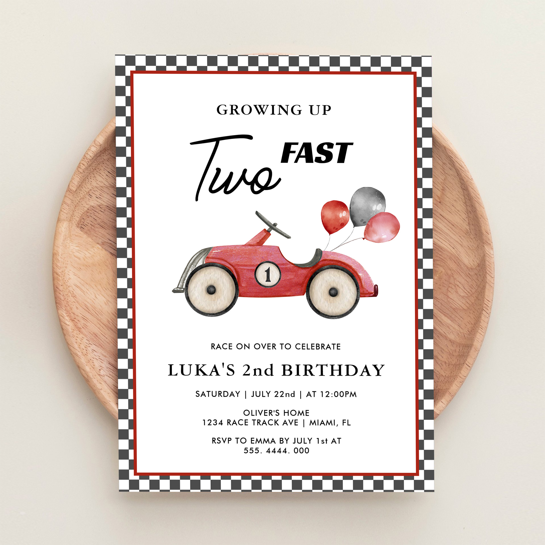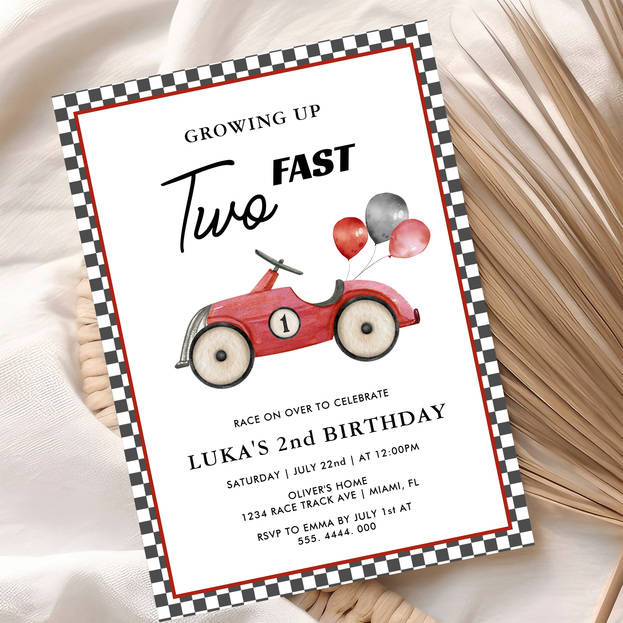 Two Fast Red Race Car Boys 2nd Birthday Invitation