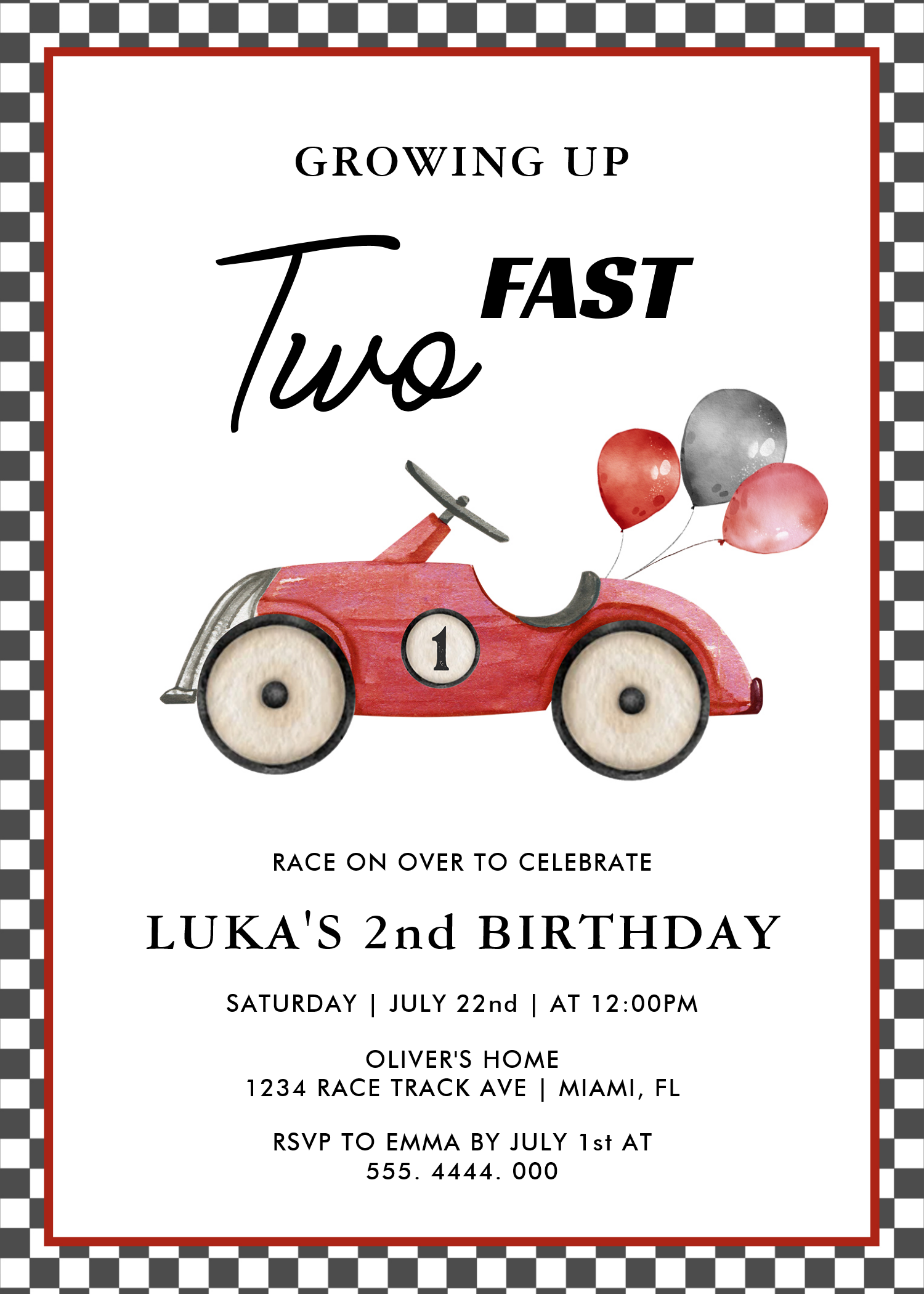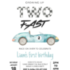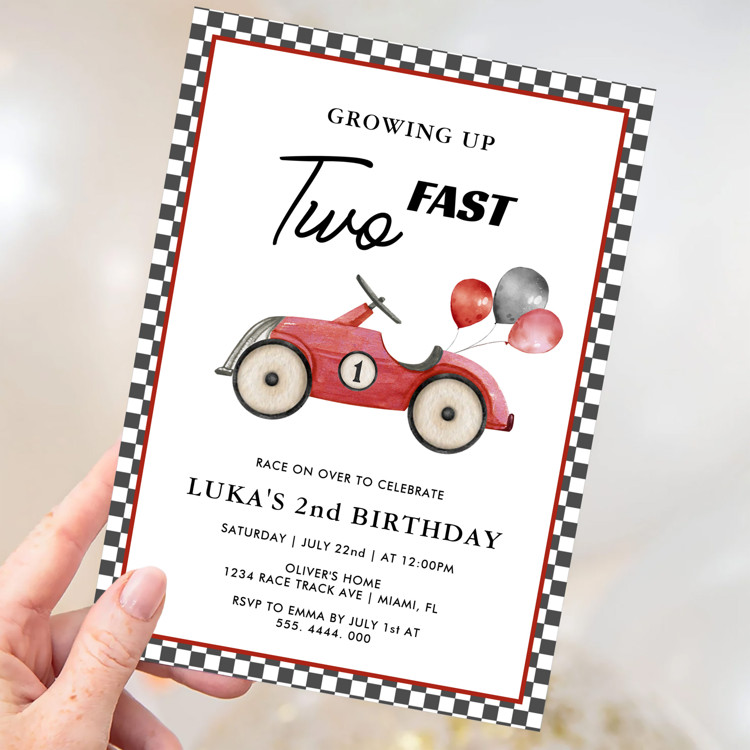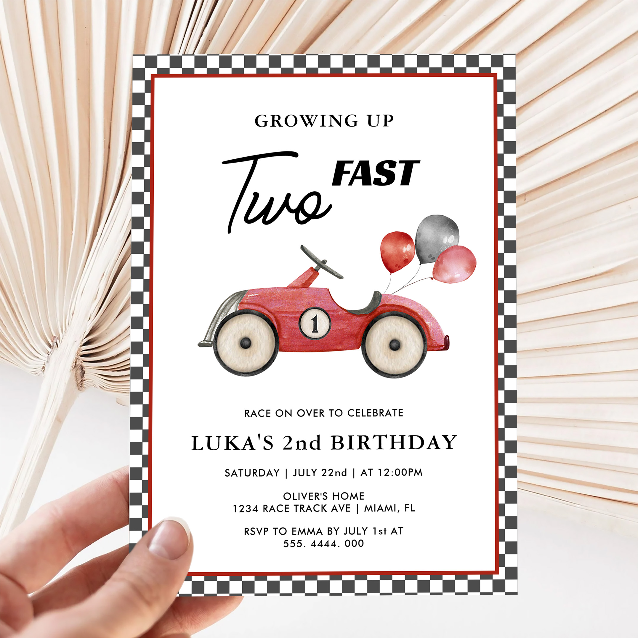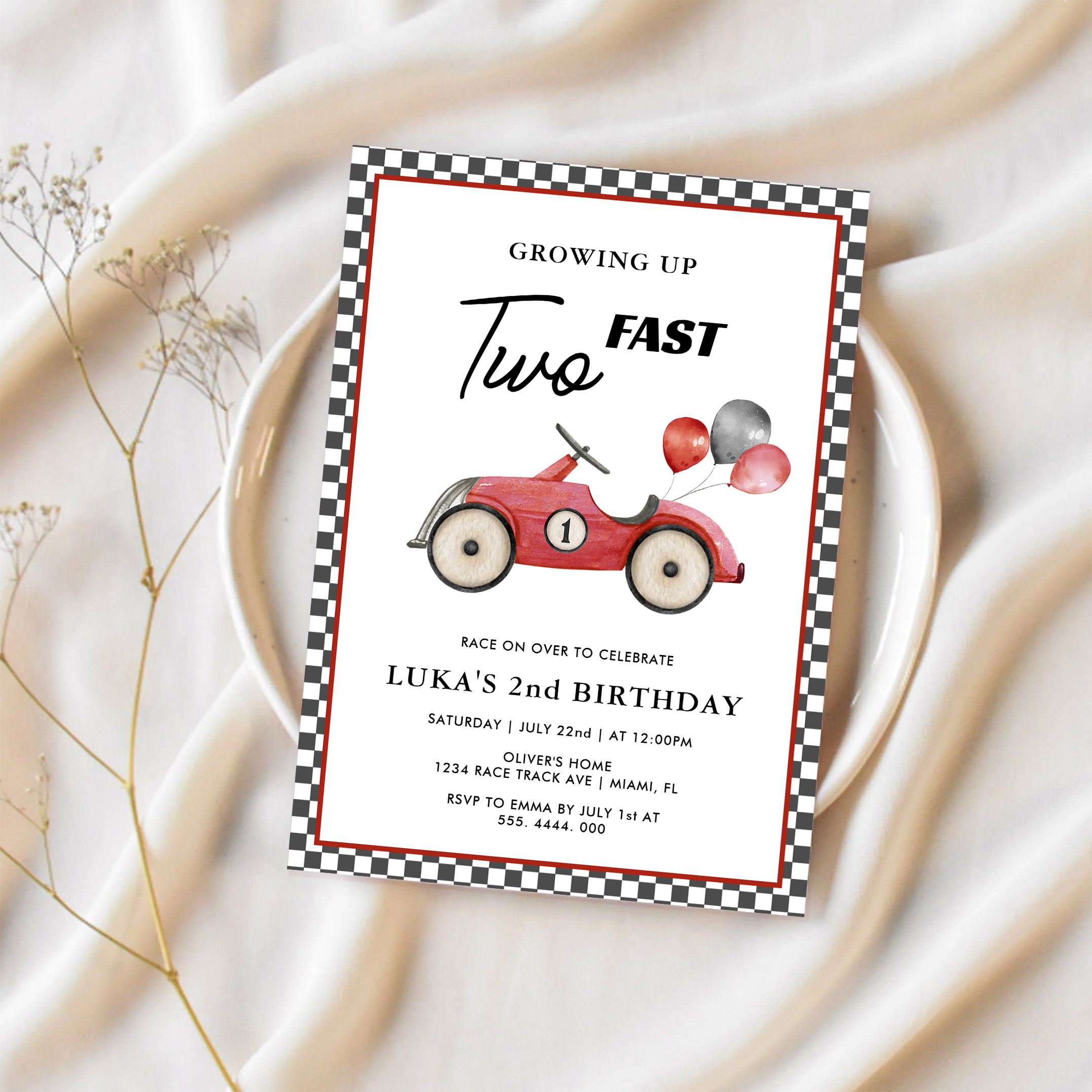 Two Fast Red Race Car Boys 2nd Birthday Invitation