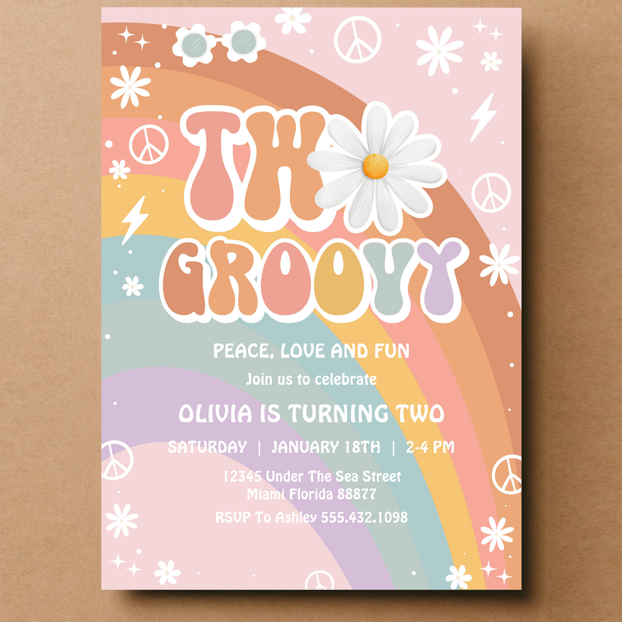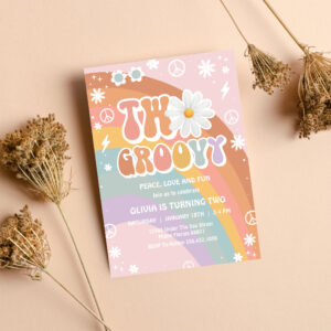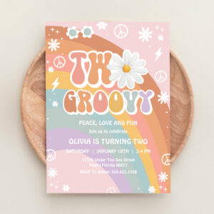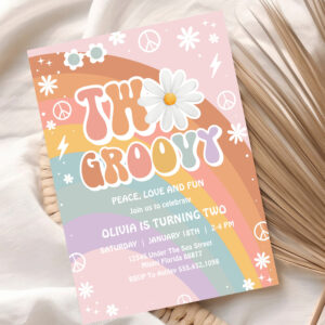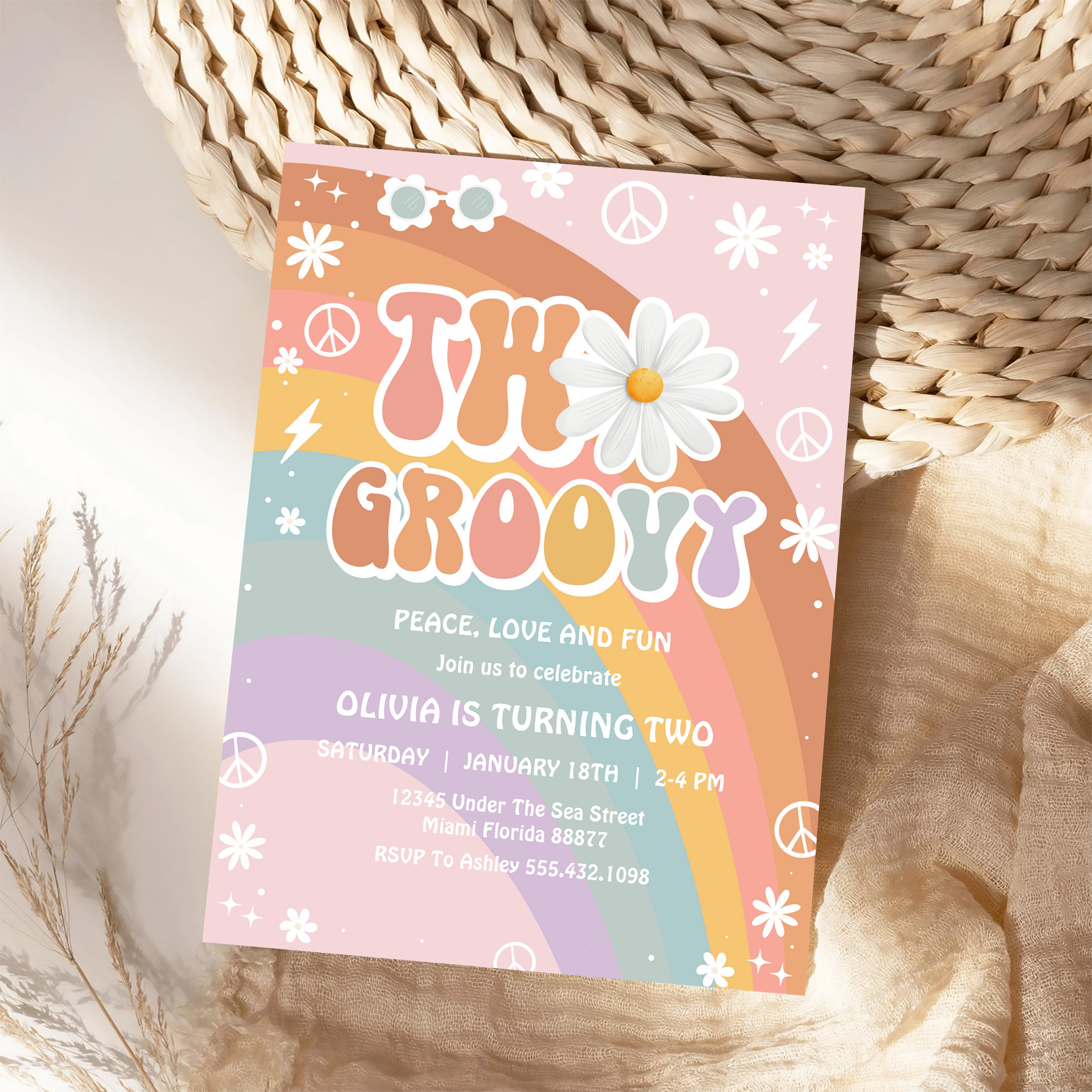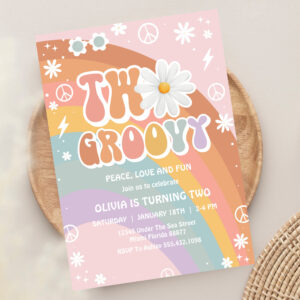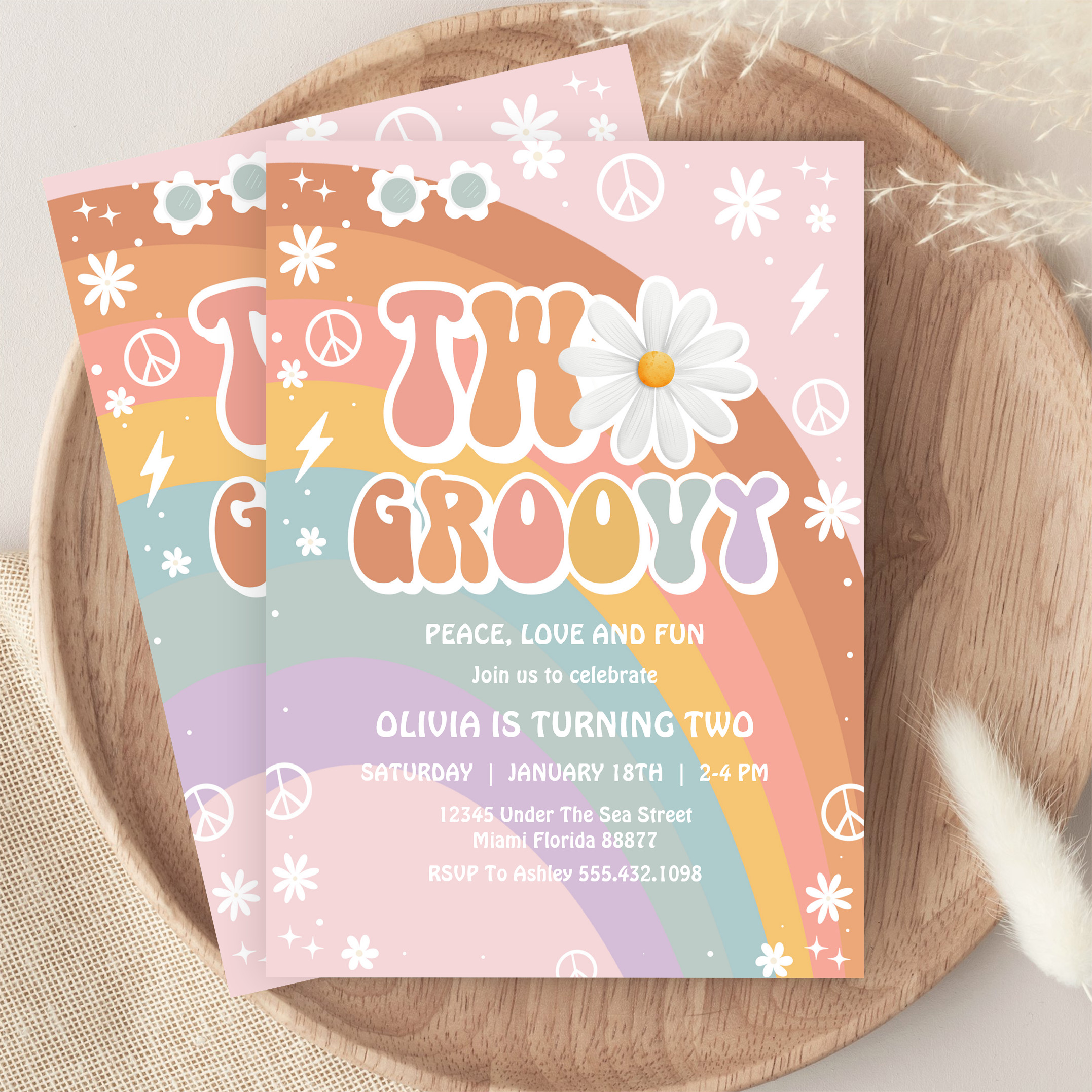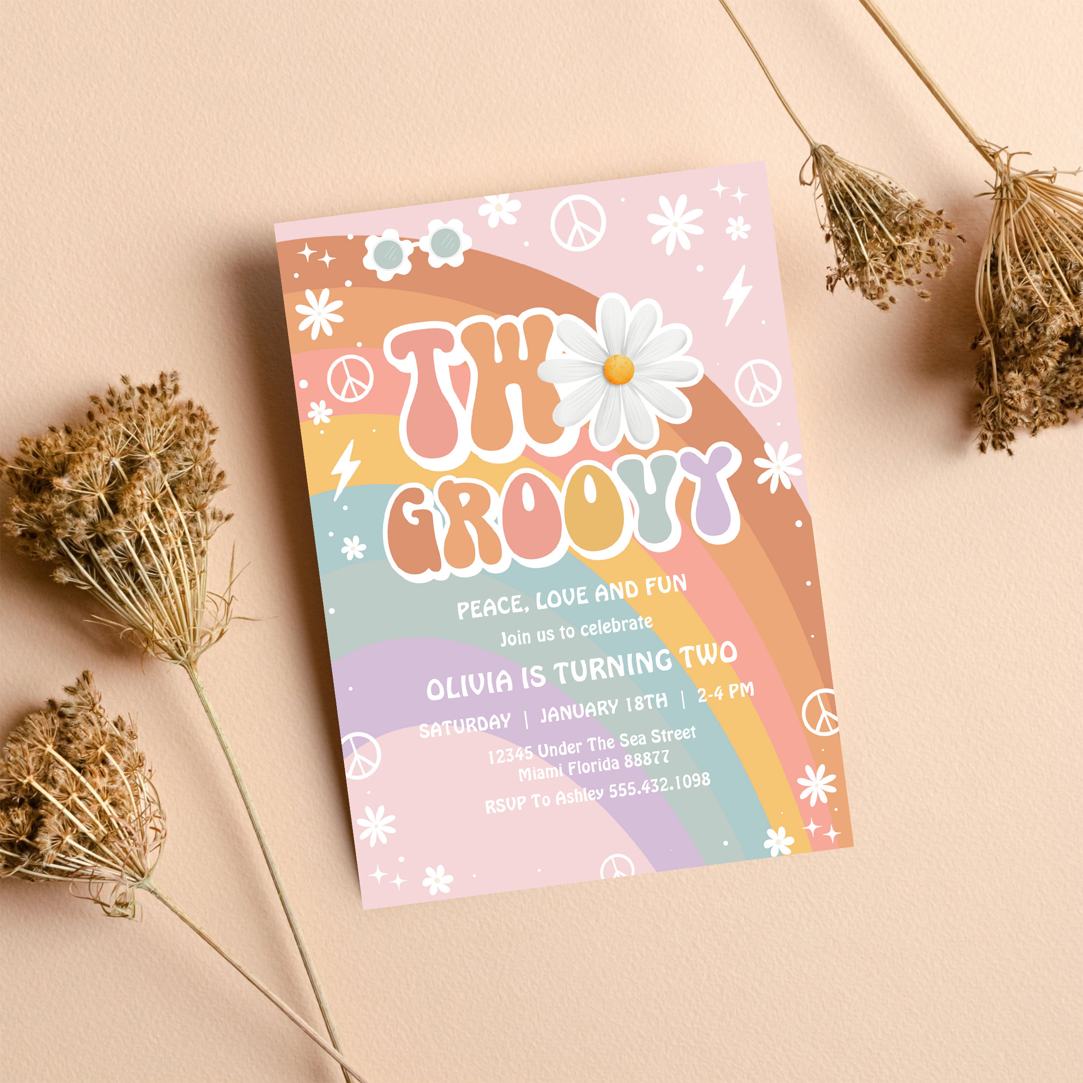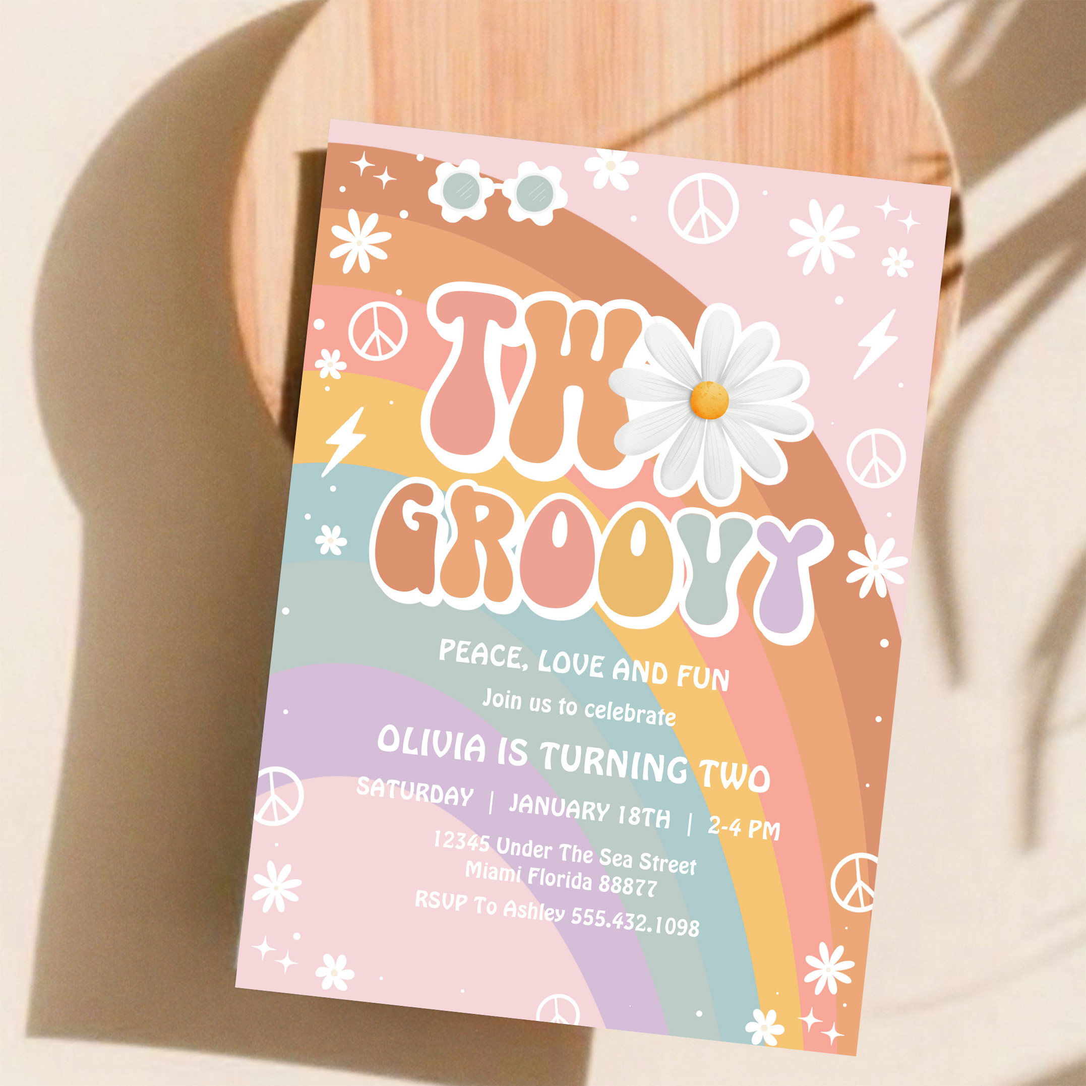 Two Groovy Hippie Pink Daisy Rainbow 2nd Birthday Invitation - Related products