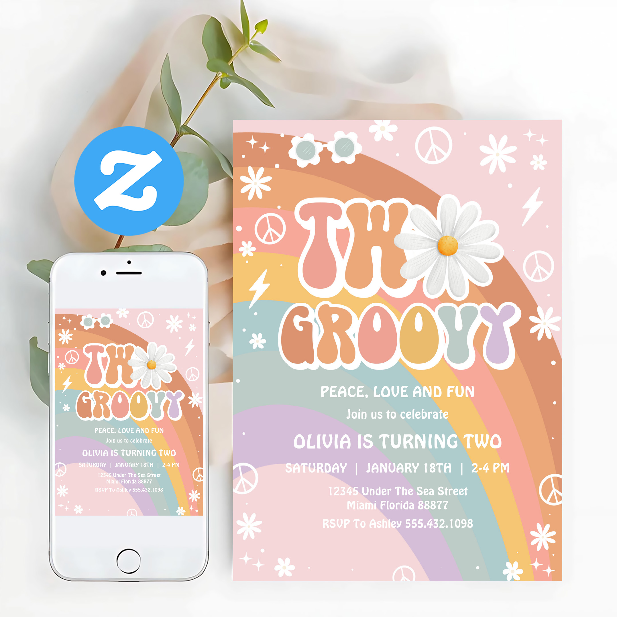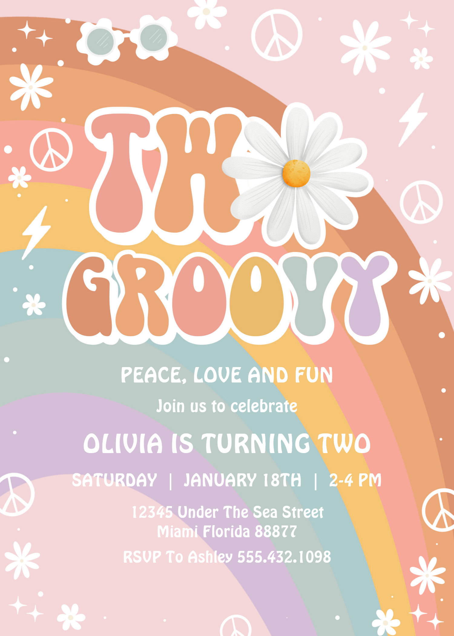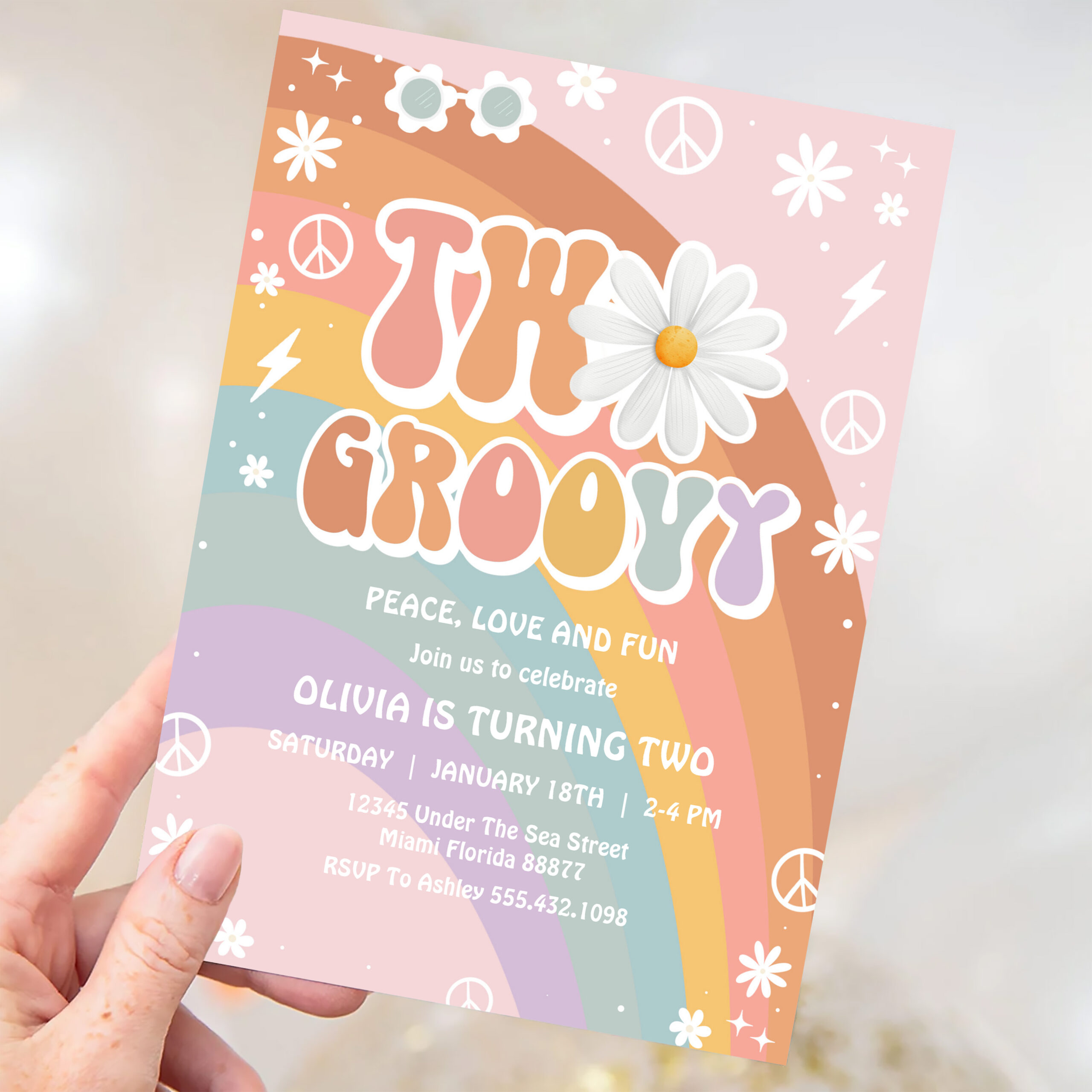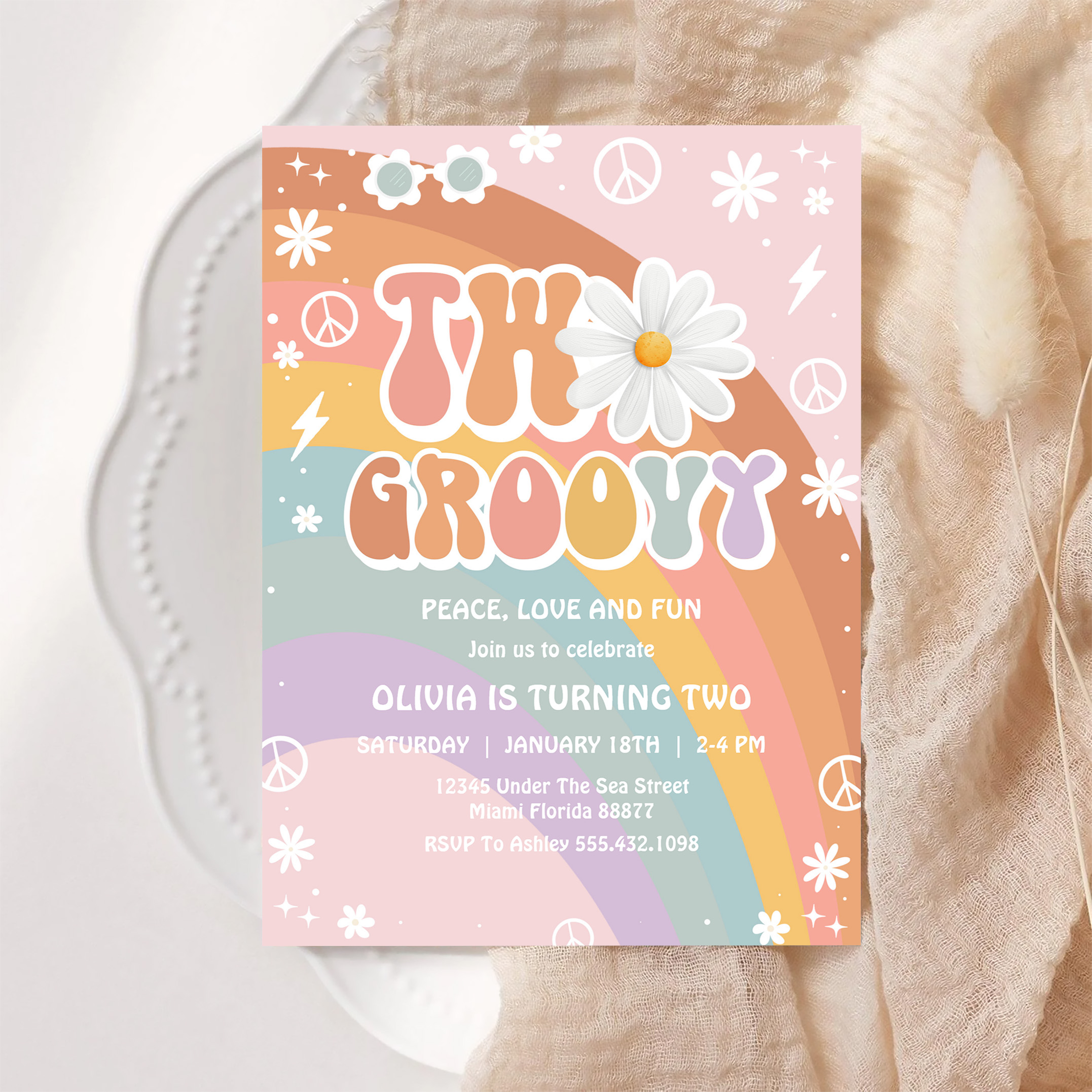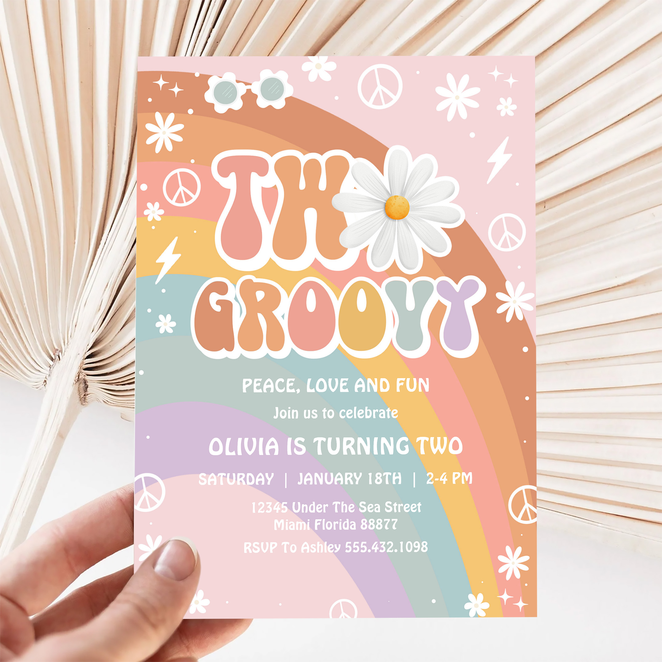 Two Groovy Hippie Pink Daisy Rainbow 2nd Birthday Invitation - Related products