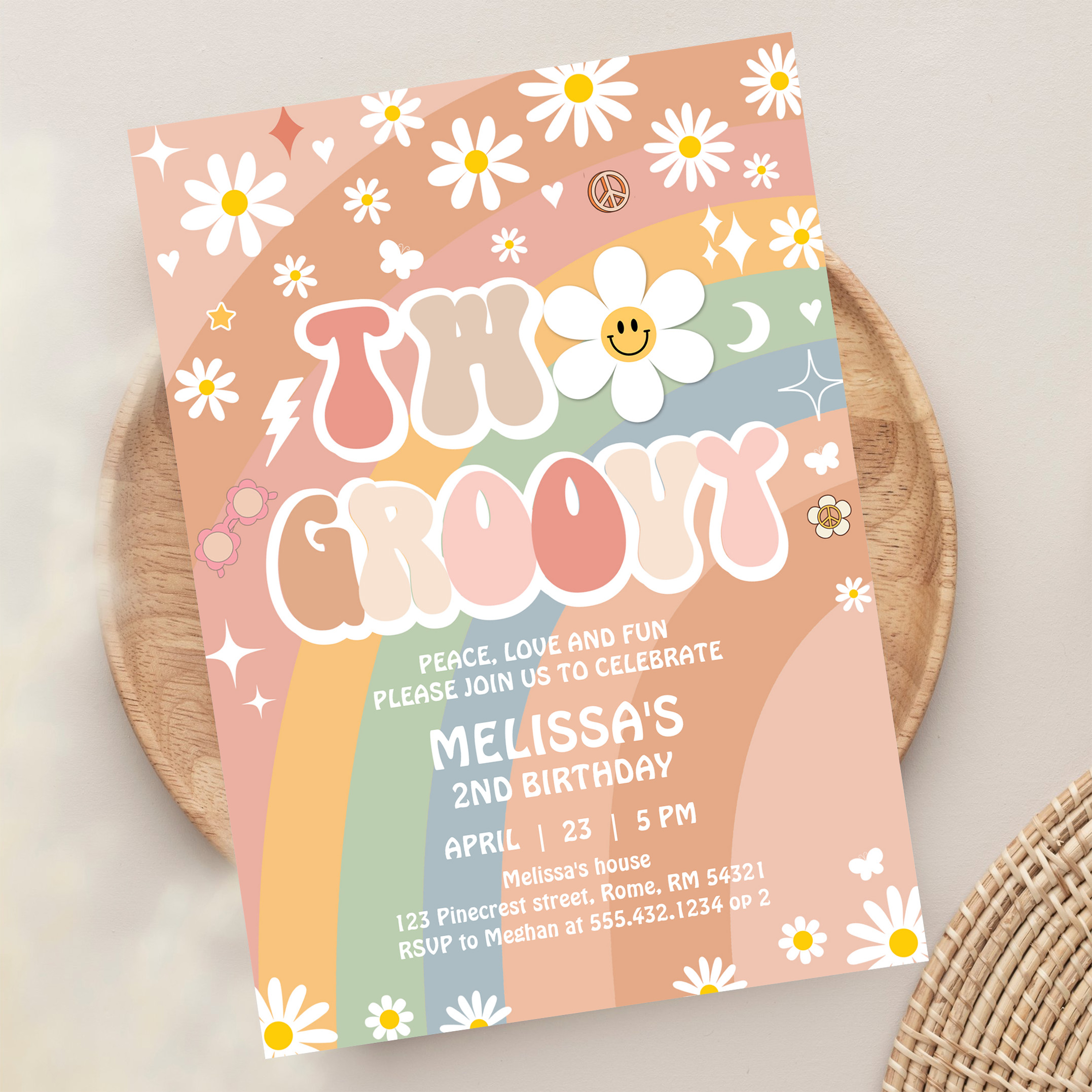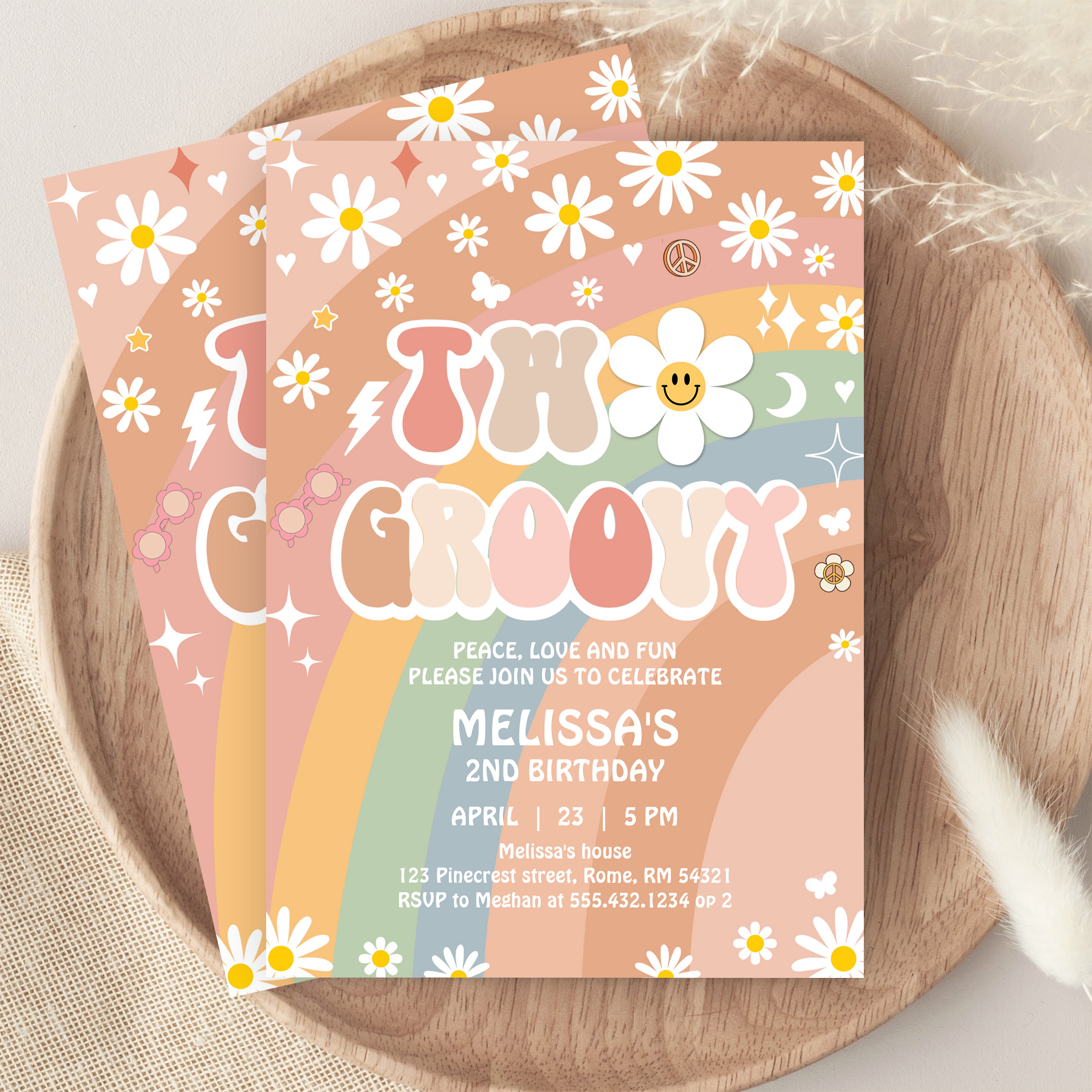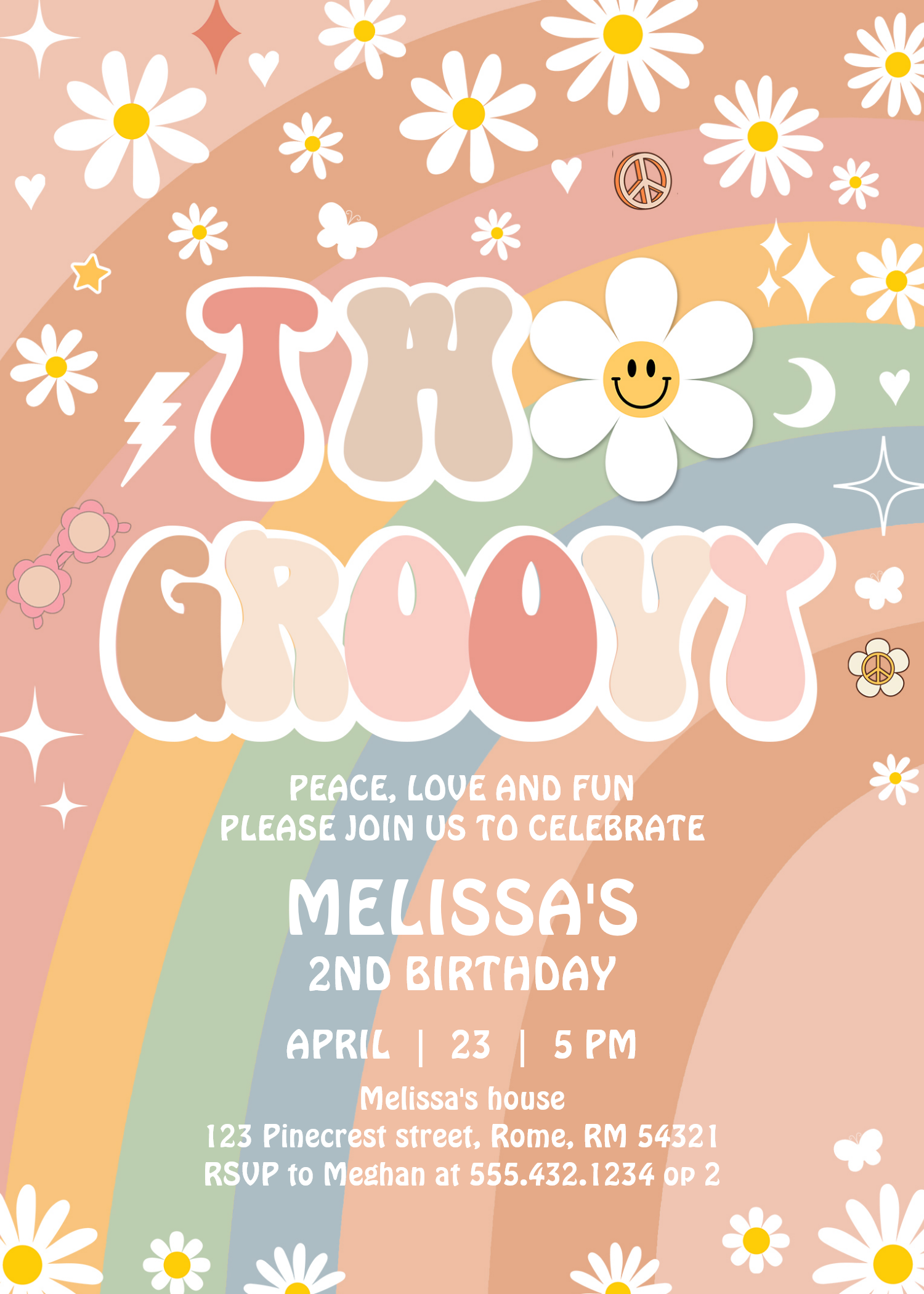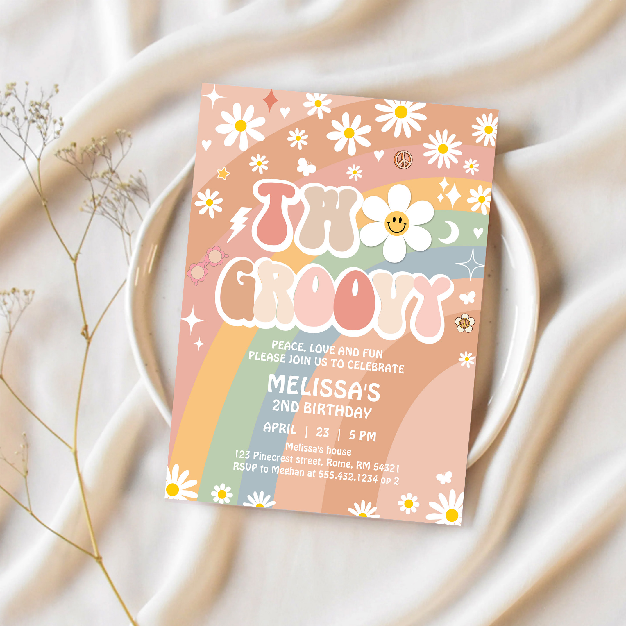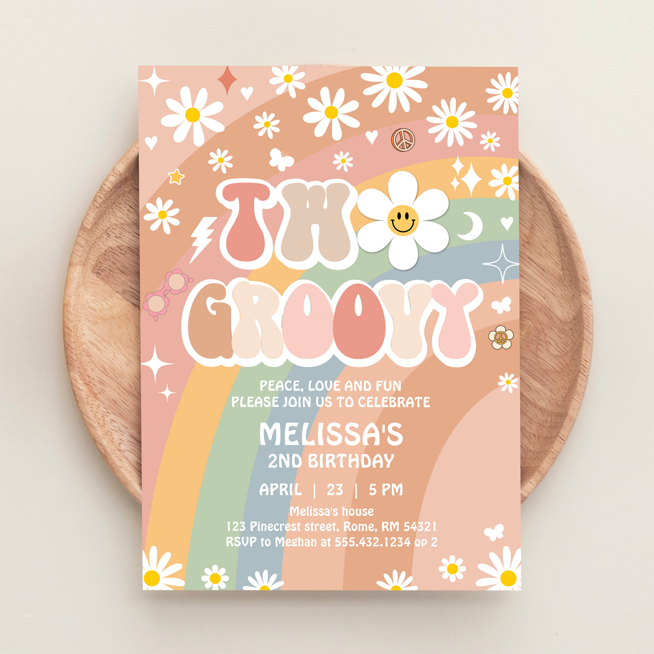 Two Groovy Rainbow Hippie Retro 2nd Birthday Invitation