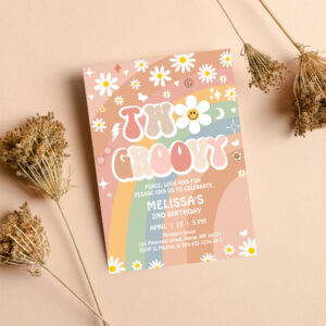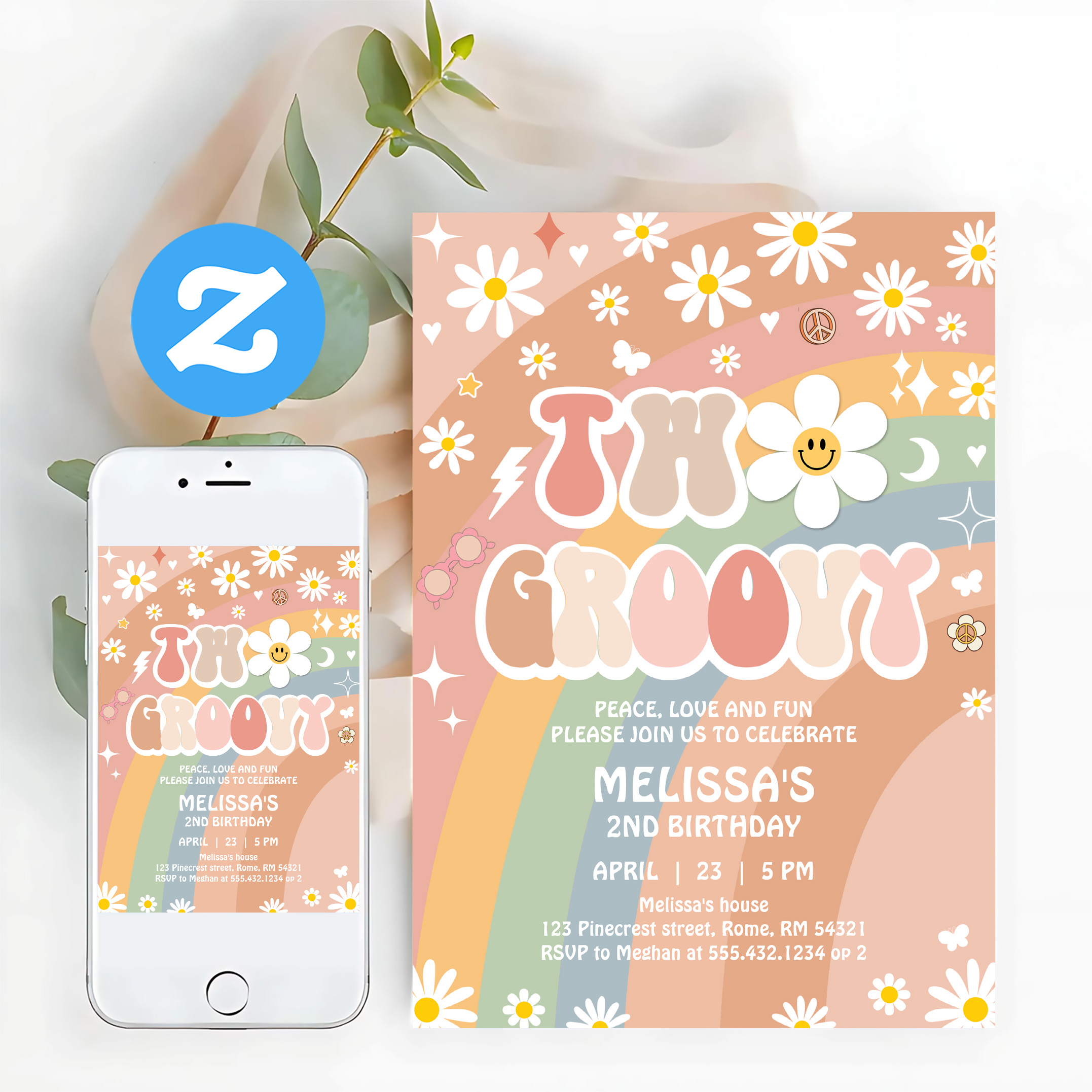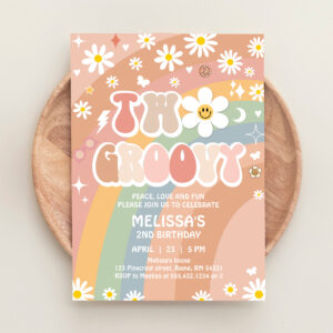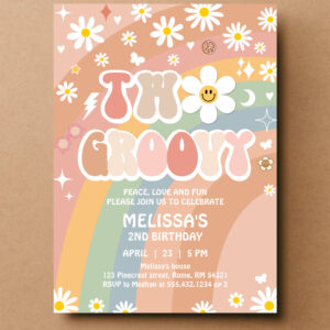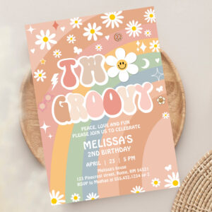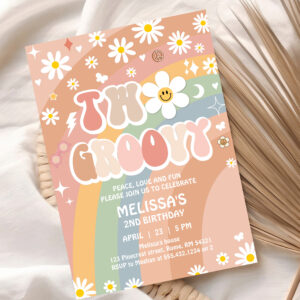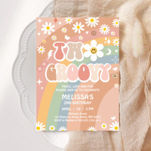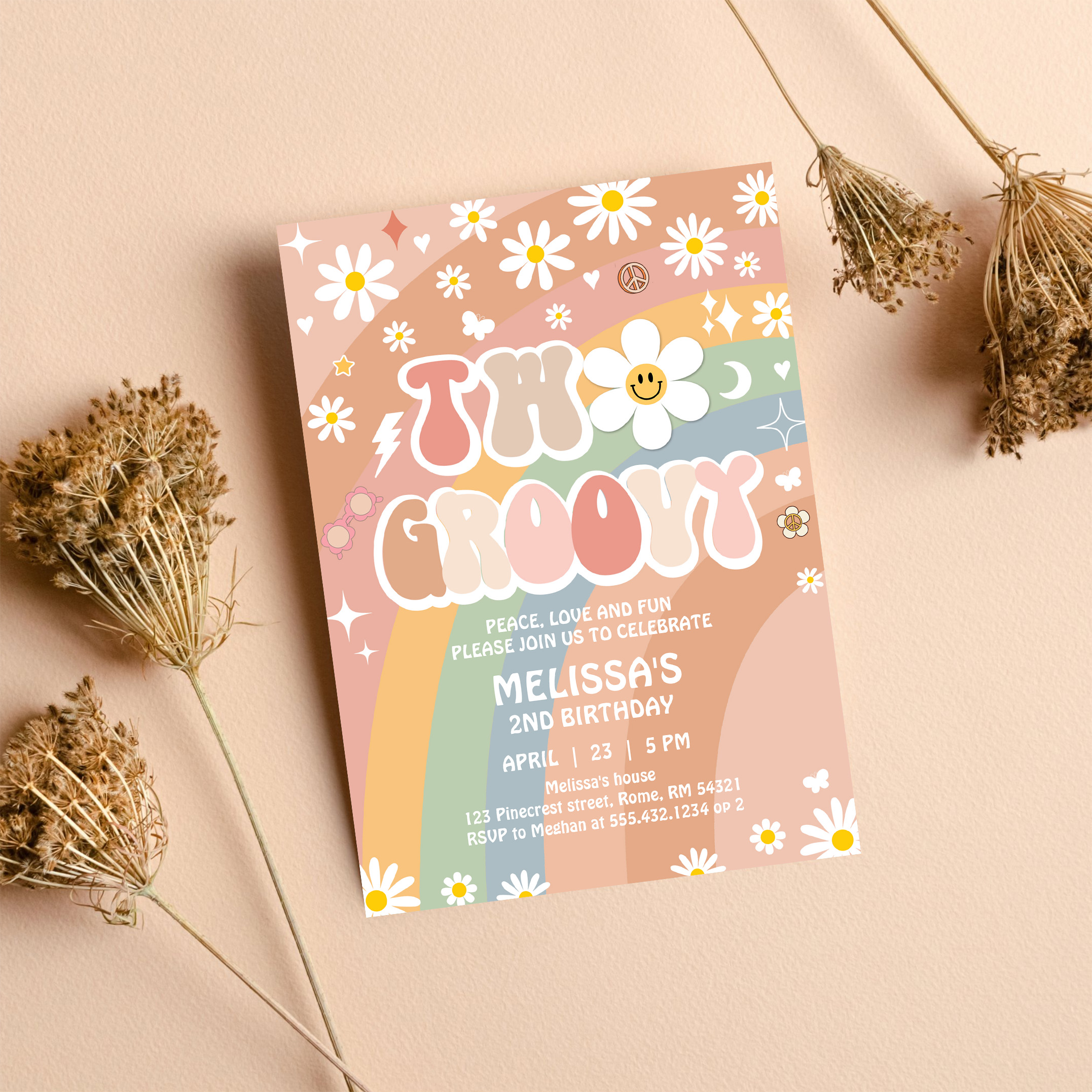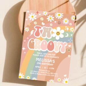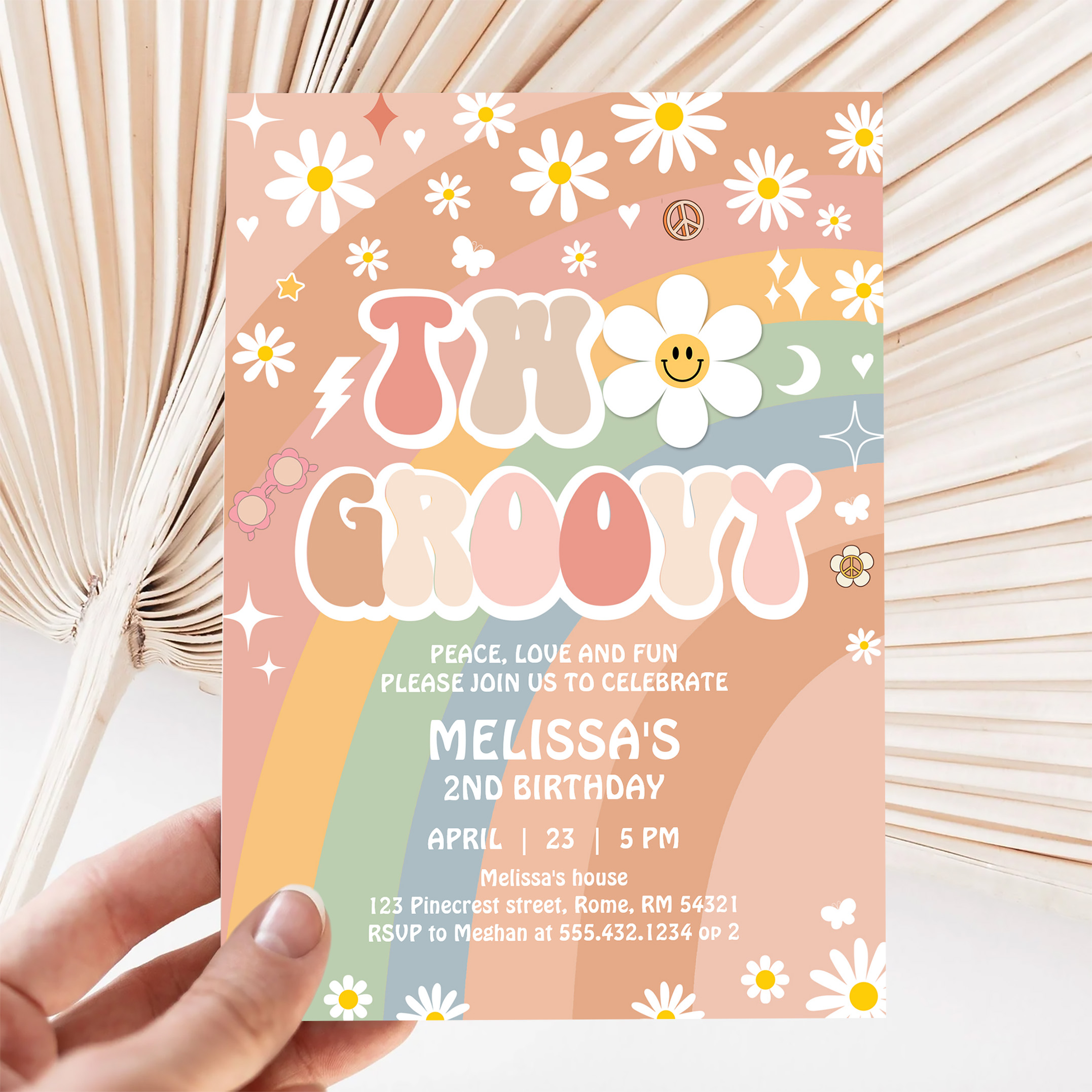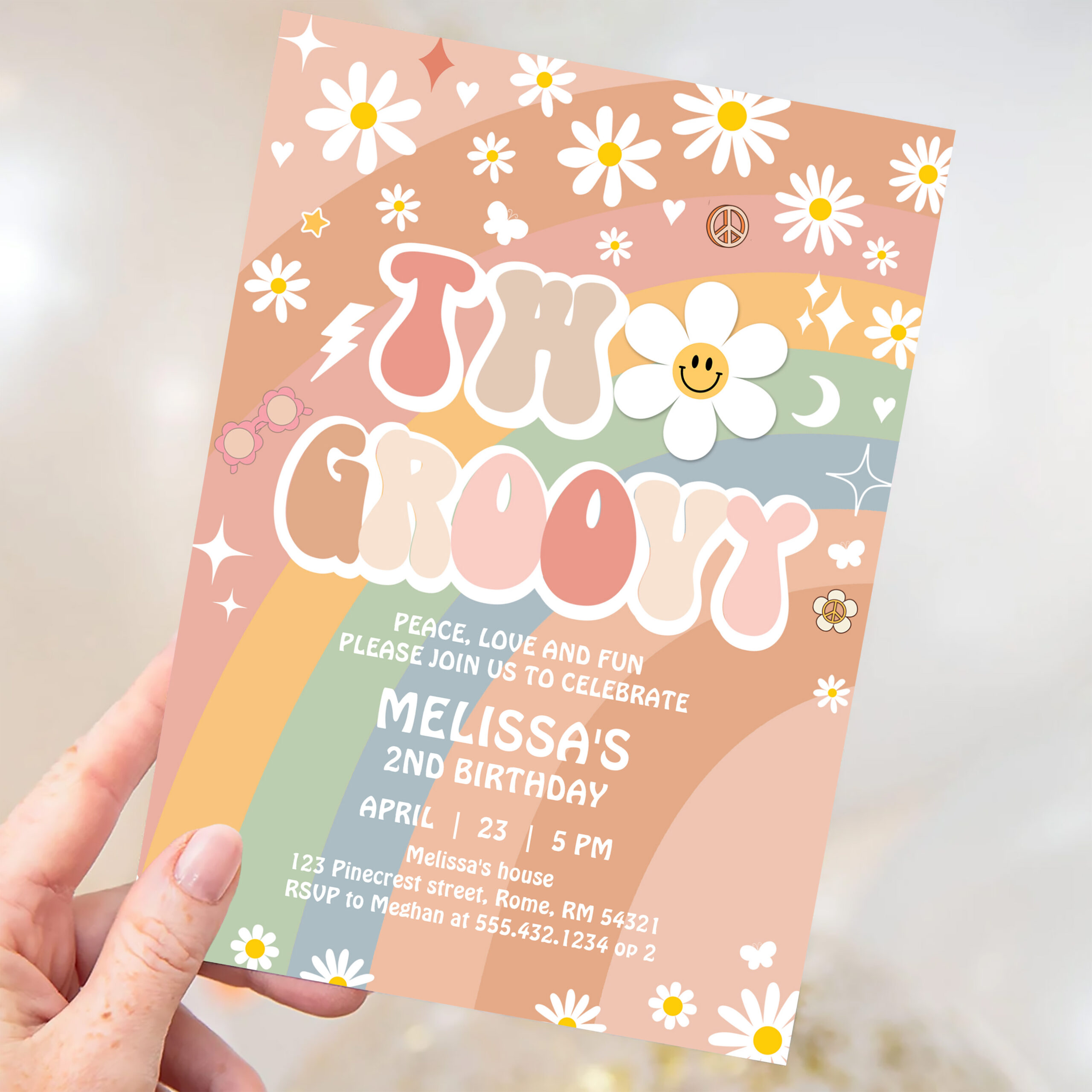 Two Groovy Rainbow Hippie Retro 2nd Birthday Invitation