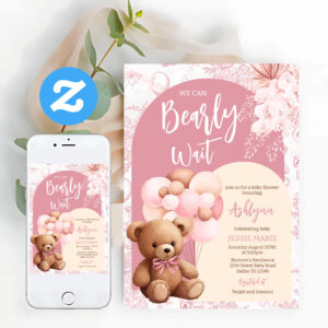 We Can Bearly Wait Brown Bear Balloon Baby Shower Invitation