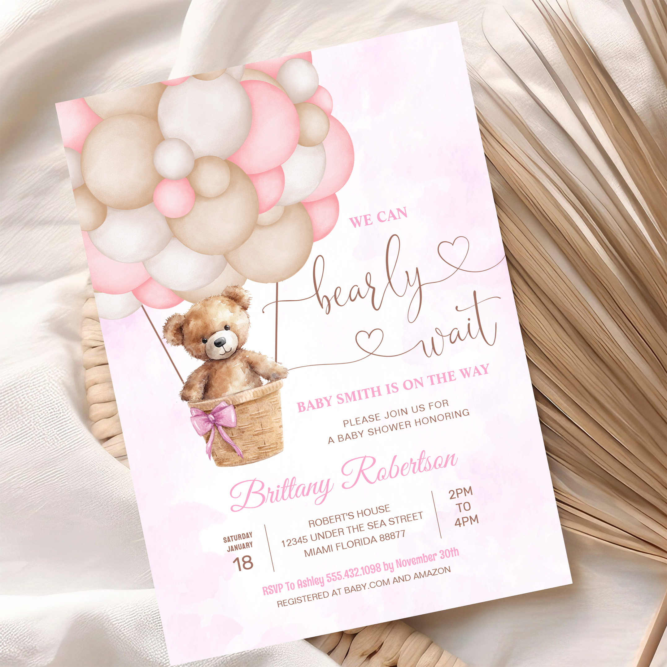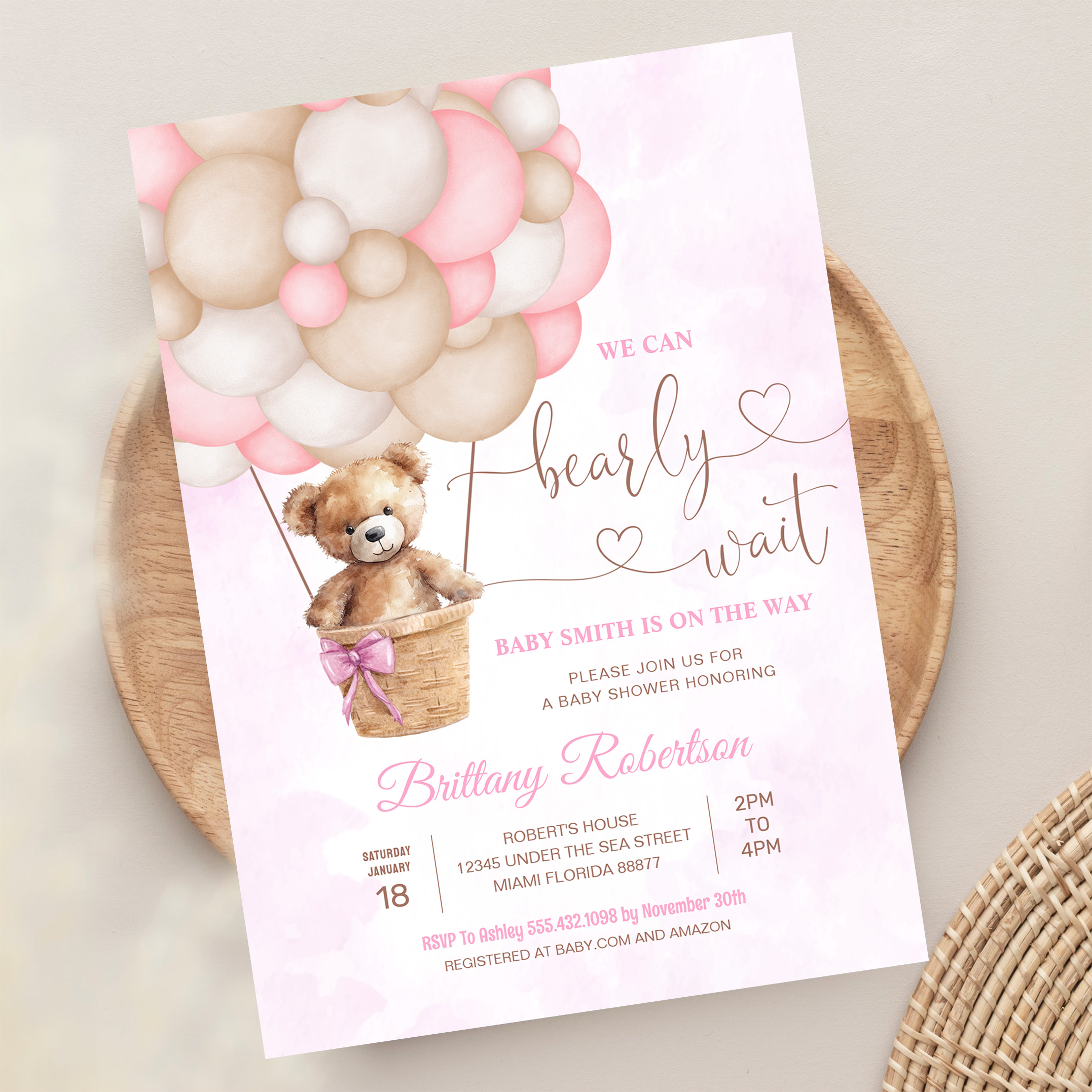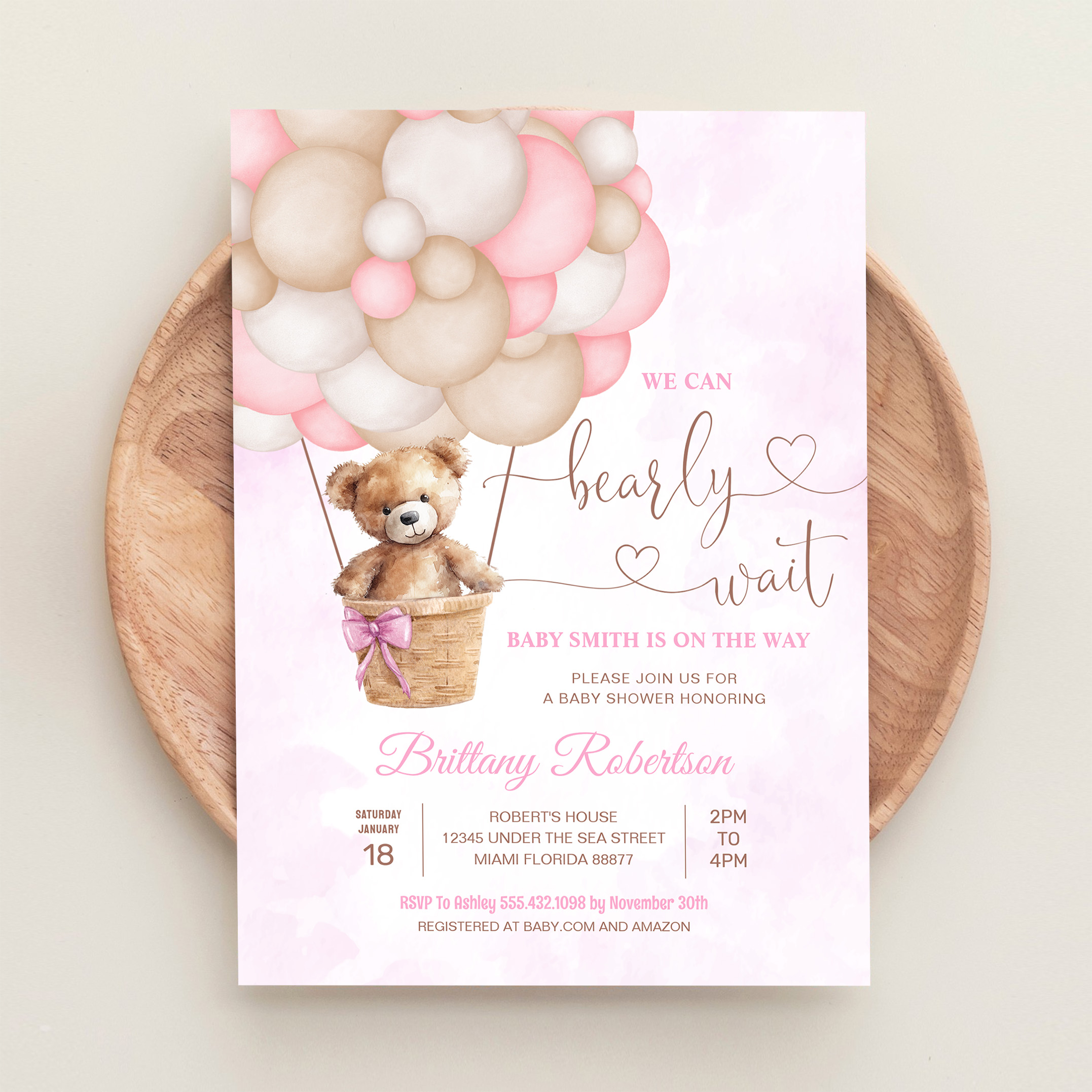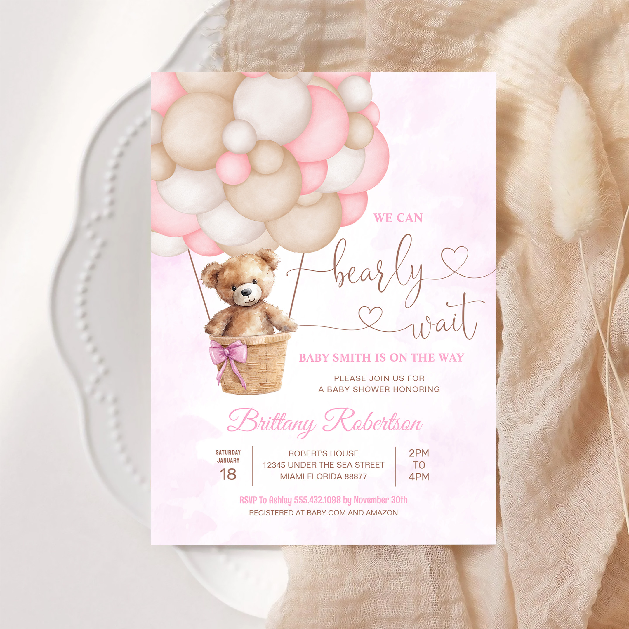 We Can Bearly Wait Girl Teddy Bear Baby Shower Invitation