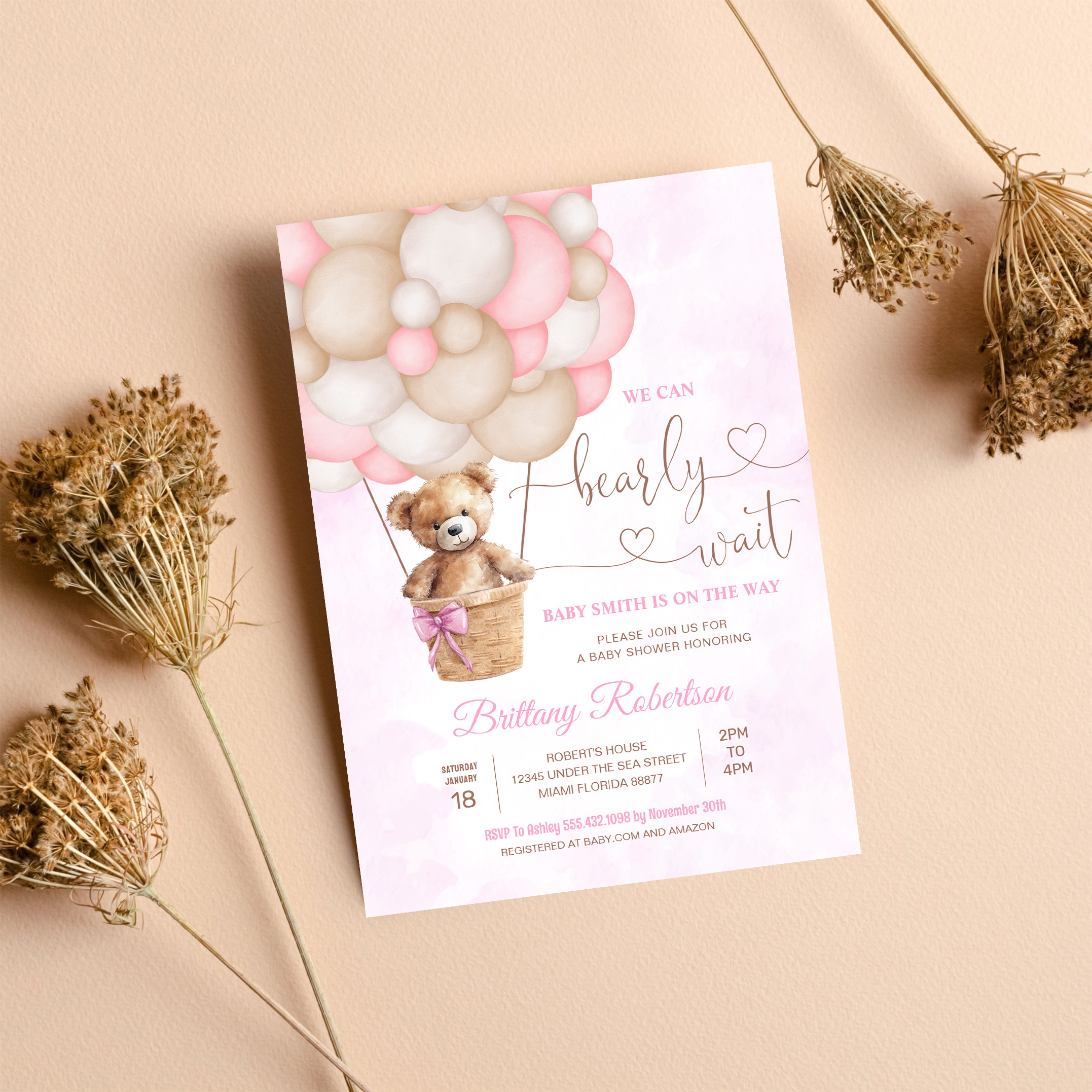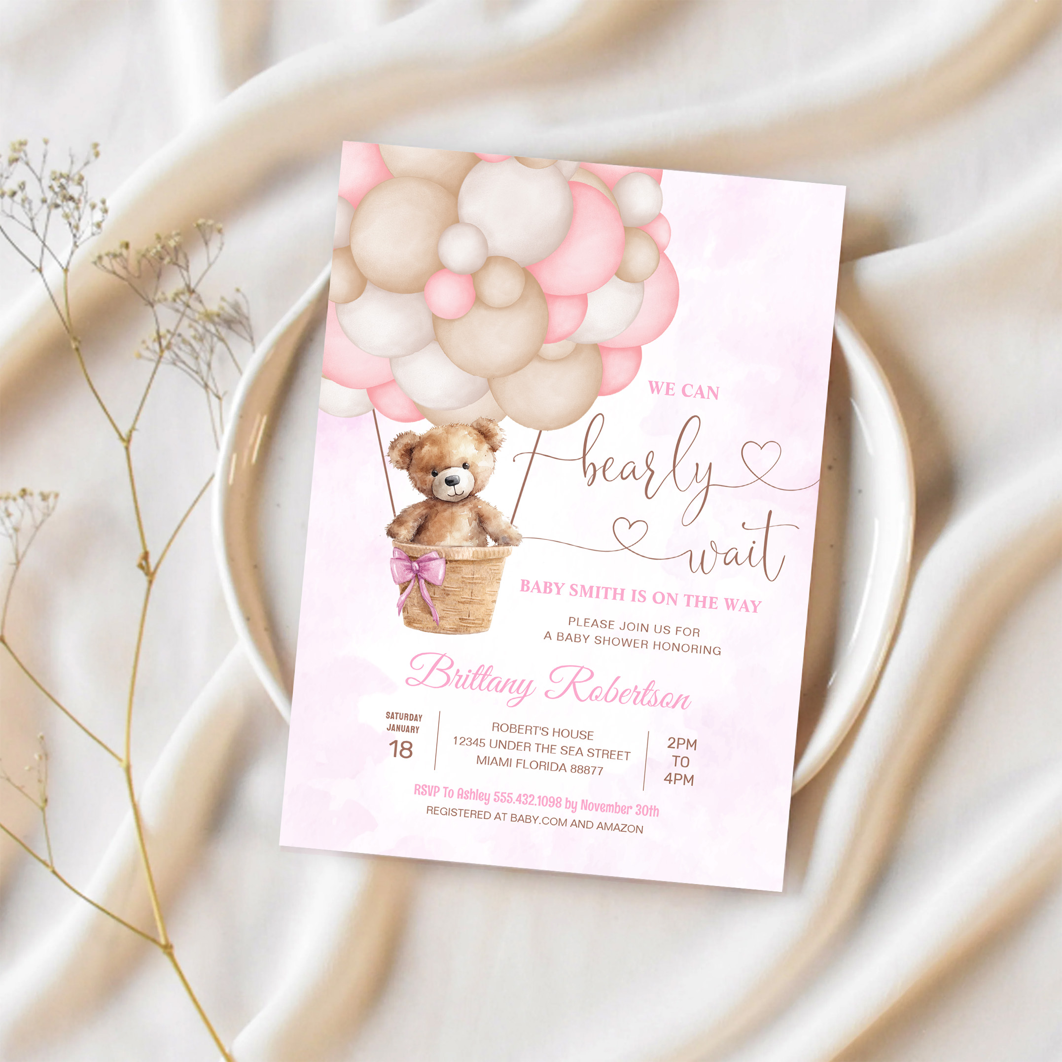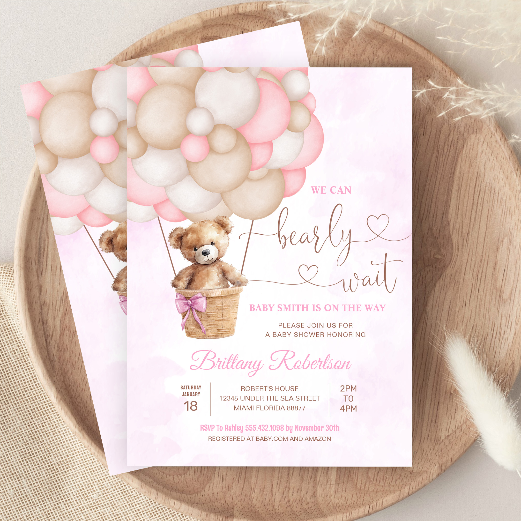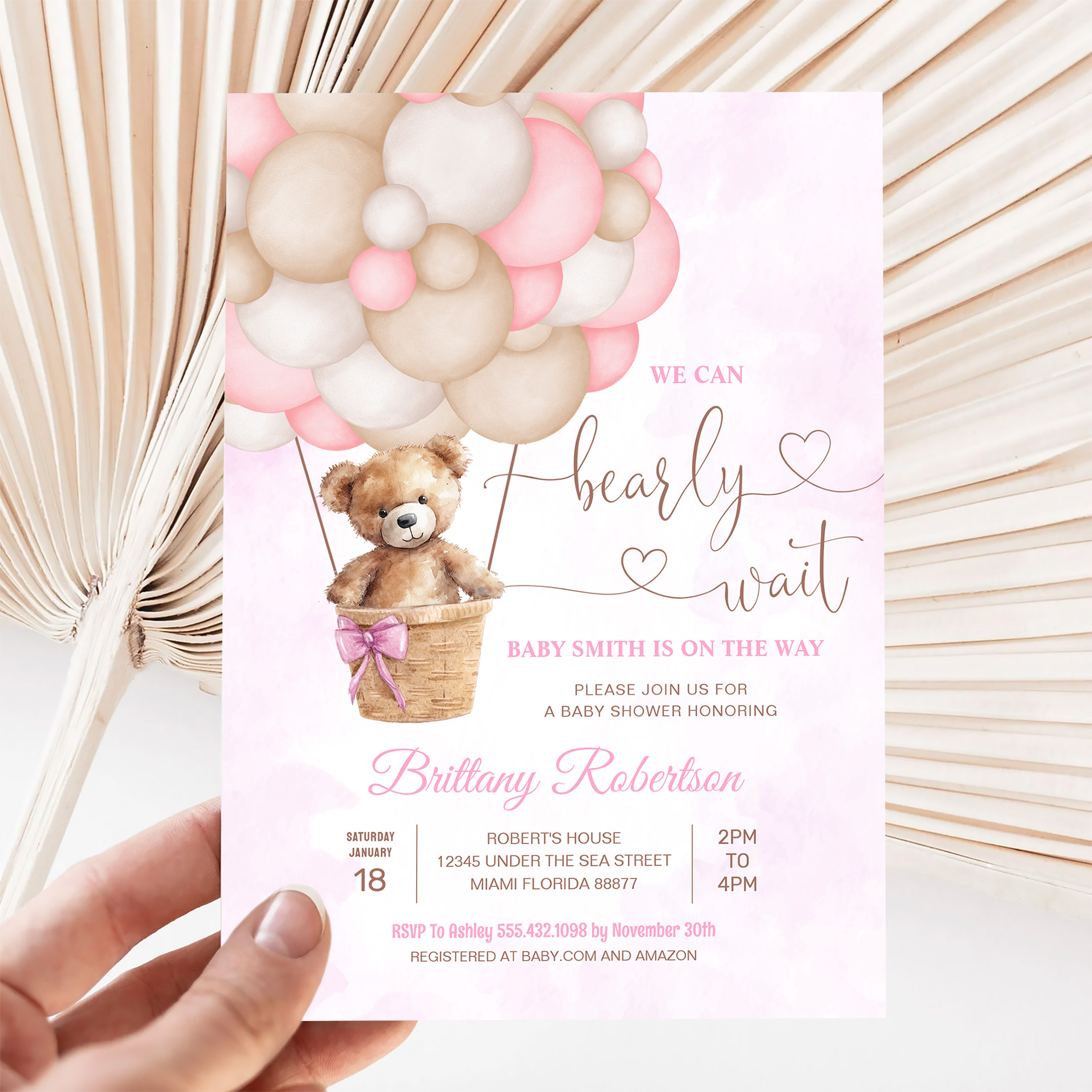 We Can Bearly Wait Girl Teddy Bear Baby Shower Invitation